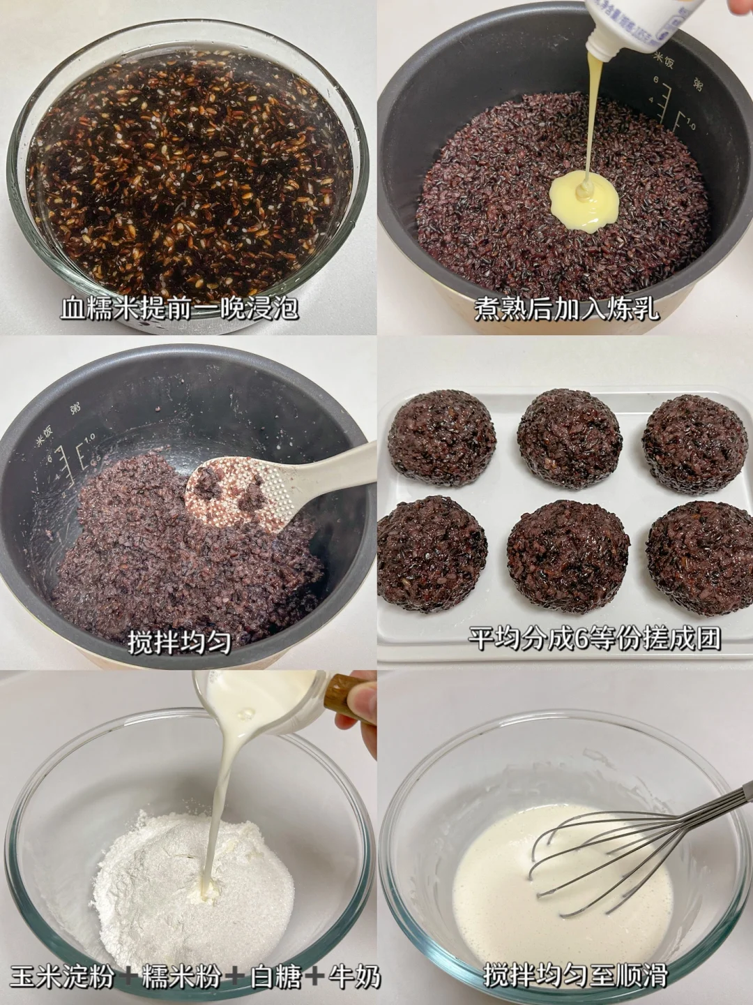 1⃣️血糯米提前一晚洗净浸泡,用电饭煲蒸熟后加入炼乳搅拌均匀,平均分成6等份搓成团备用。