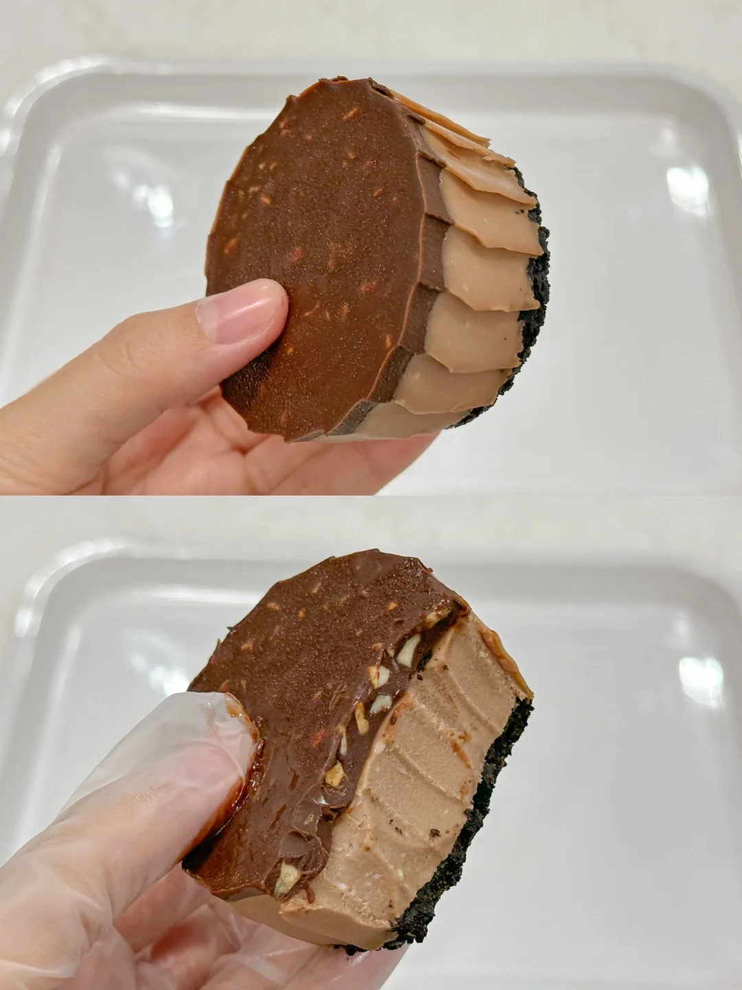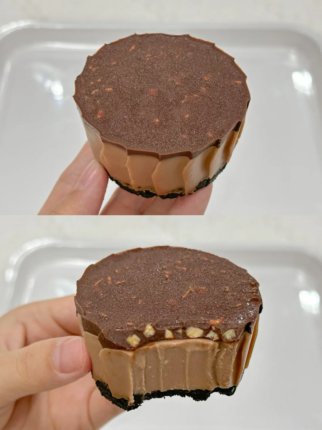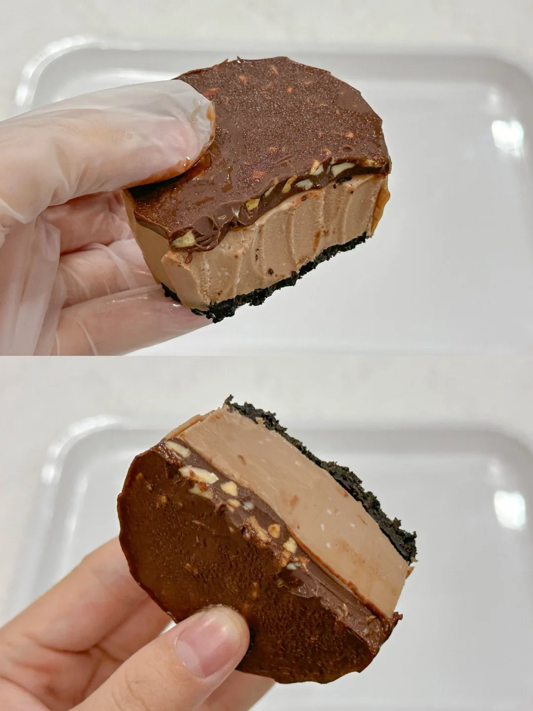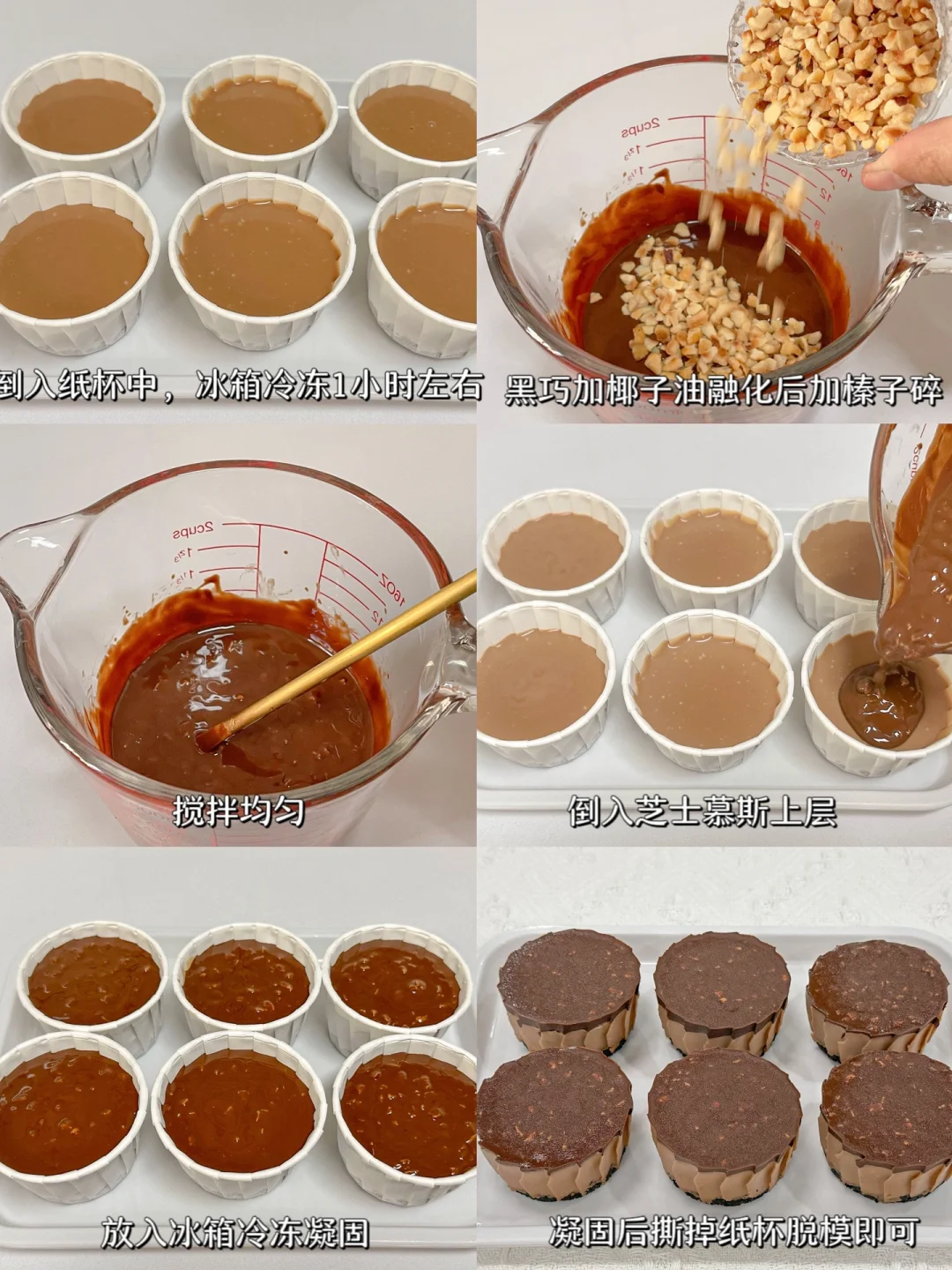 2⃣️黑巧克力+椰子油融化,加入榛子碎搅拌均匀,倒入凝固好的芝士慕斯上层,放入冰箱冷冻凝固,凝固后脱模即可开吃。
