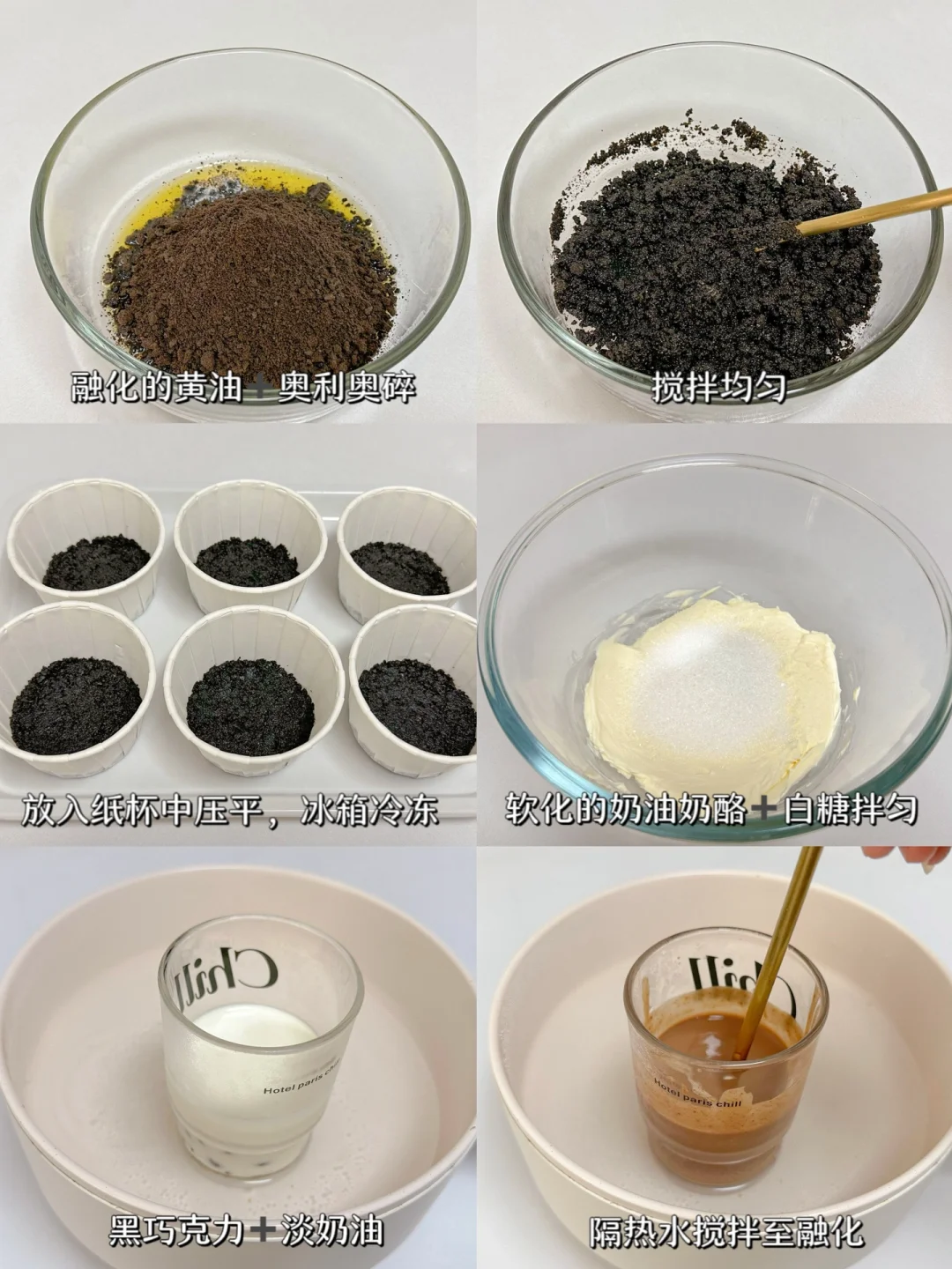 1⃣️奥利奥去掉夹心后敲碎,加入融化的黄油搅拌均匀,放入纸杯中压平整,冰箱冷冻备用。