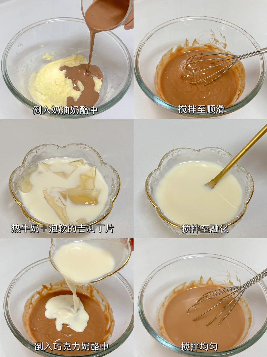 2⃣️软化的奶油奶酪+白糖搅匀,黑巧克力+淡奶油隔热水搅拌至融化后倒入奶油奶酪中搅拌顺滑,热牛奶+泡软的吉利丁片搅拌融化,倒入巧克力奶酪中搅拌均匀,倒入纸杯中,冰箱冷冻1小时左右。