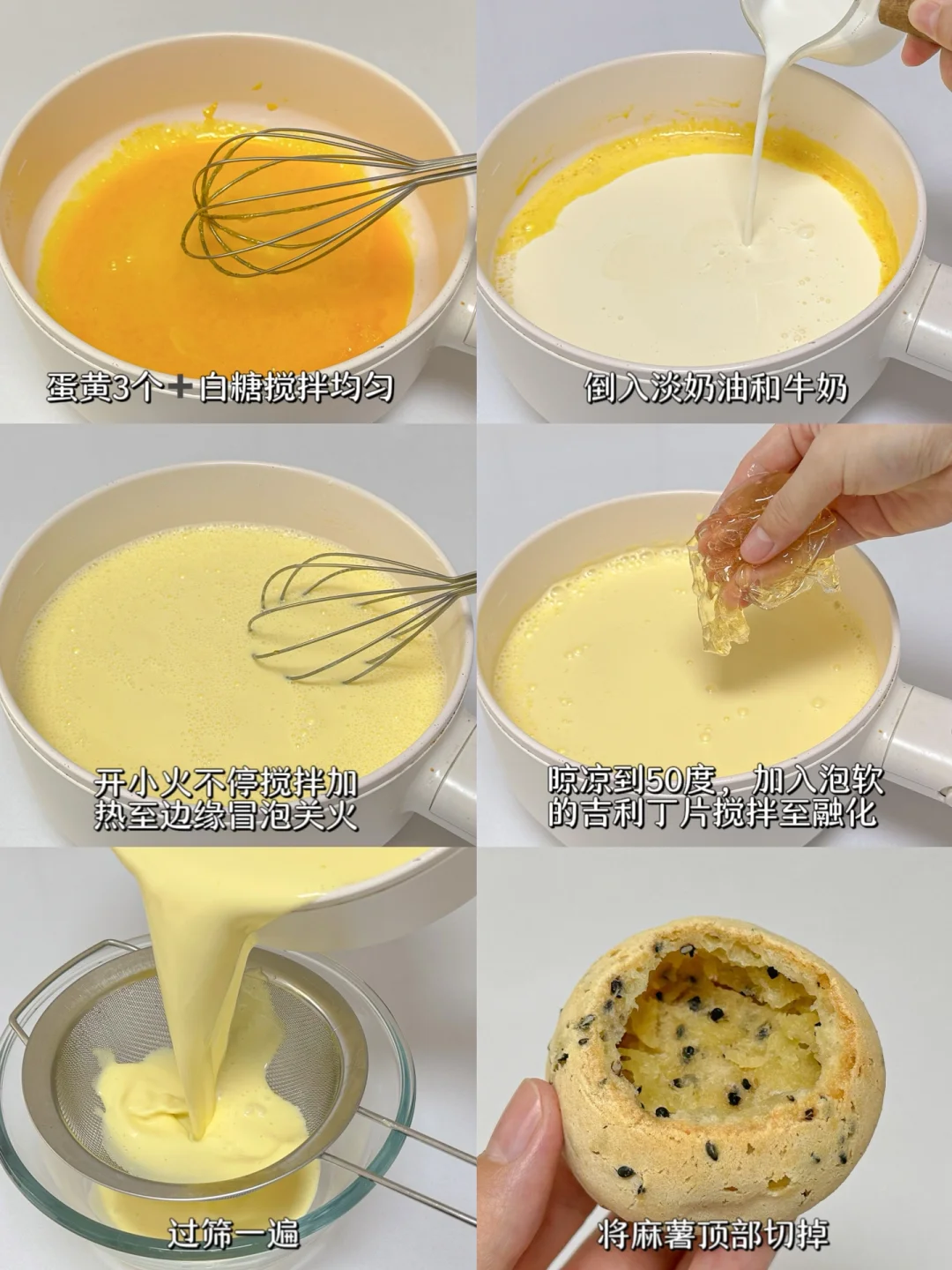 2⃣️蛋黄3个+白糖搅拌均匀,倒入淡奶油和牛奶,开小火加热不停搅拌至边缘冒泡关火,晾凉到50度,加入泡软的吉利丁片搅拌至融化,过筛一遍备用。
