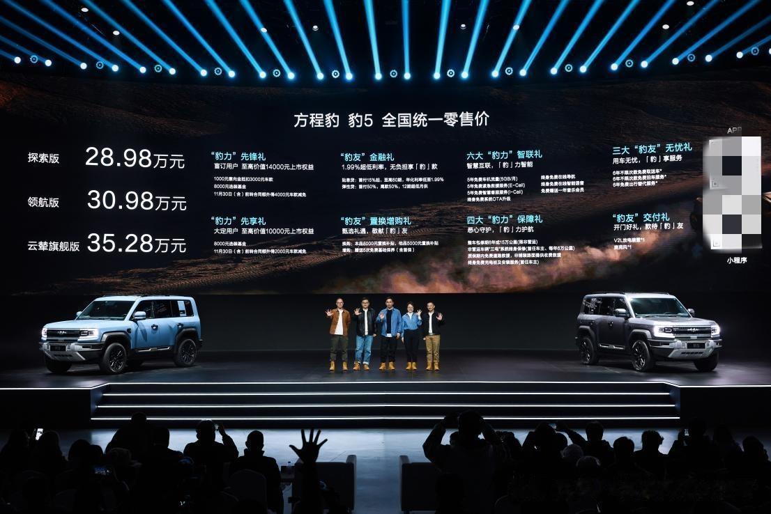 方程豹5昨天正式上市,售价28.98-35.28万元。该车搭载1.5T高功率+前后双电机的插电式混动系统,越野能力已经有很多博主聊过,百哥就不多费口舌介绍了。我看了一下配置,28.98万起步的入门版和高配仅有副驾驶屏幕、座椅材质的区别,可以说性价比拉满。你觉得方程豹5的售价如何?#方程豹# #比亚迪# #新能源汽车#