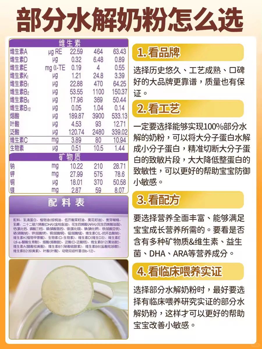 而且一定要选100%部分水解且经过临床喂养实证的,将大分子蛋白水解成小分子蛋白,没有整蛋白的残留,才能真正有效帮助防御小敏感。