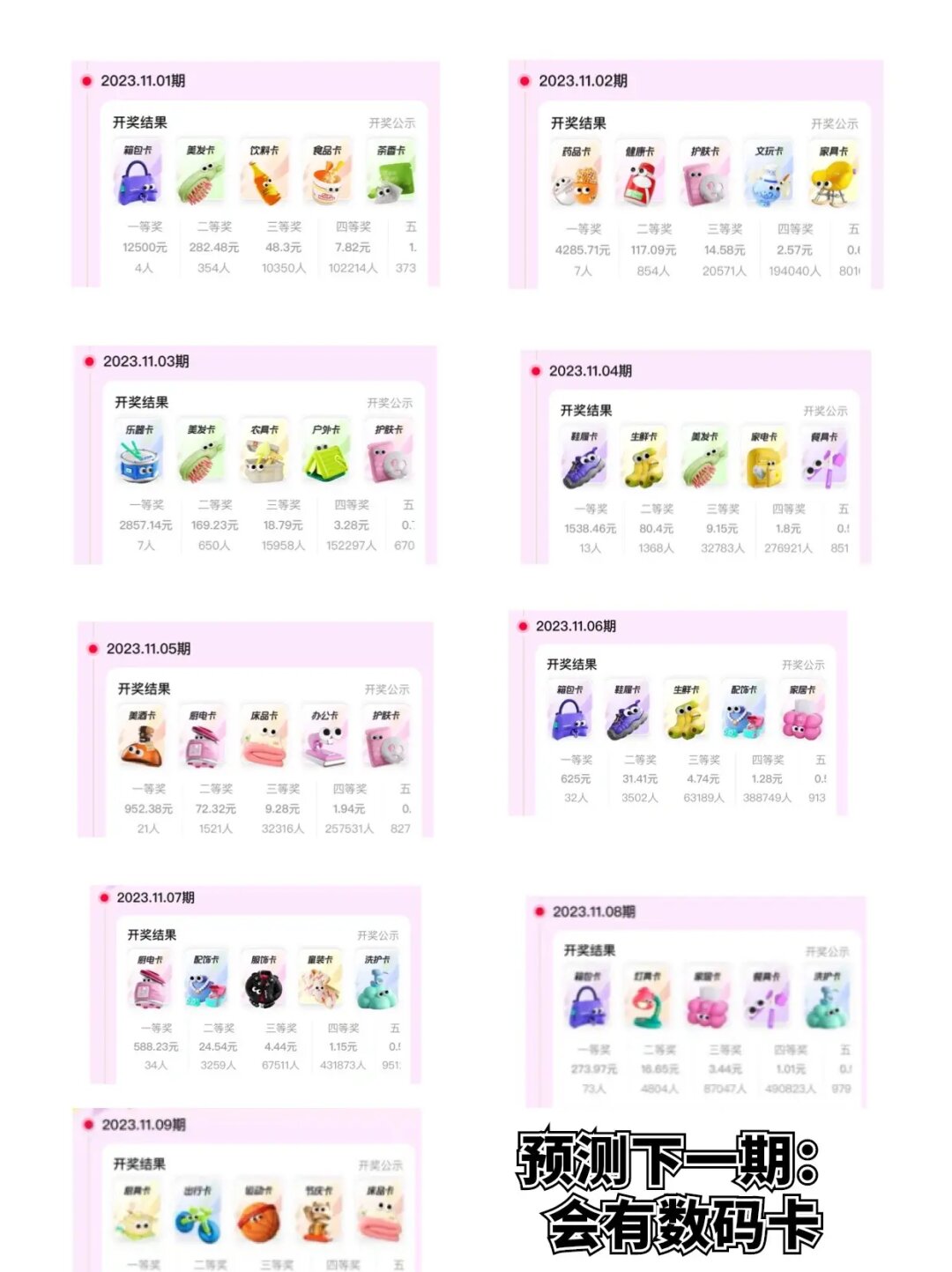 如果你是中奖绝缘体,那就是你还没玩过拍拍乐!双十一,跟上了!!宝子! 双11拍拍乐是淘宝双十一推出的一个游戏!玩法简单:集够5张图,每晚20:00看开奖图即可!图片一样则中奖,图片相同越多等级越高,瓜分的金额更多多。 【具体玩法路径】:打开淘宝搜索框 右上角相机拍物品即可到(图二),集齐五张即可!【经验总结】 1️⃣根据近期开卡经验,图三可作为这几天的攻略参考哦! 2️⃣重复出现相同卡片类型的频率很高,例如美发卡3次,护肤卡3次! 3️⃣每人每日可收集两期,需要每天下午6带你前哦!