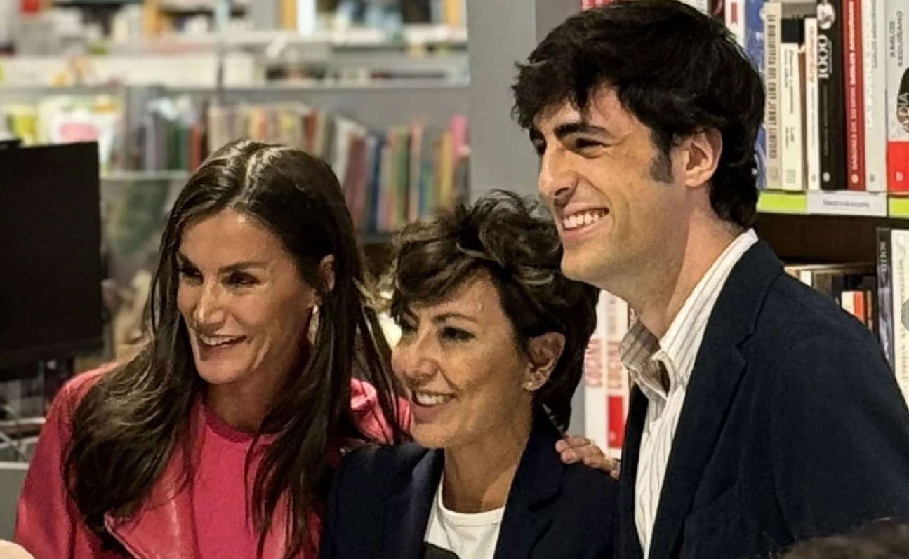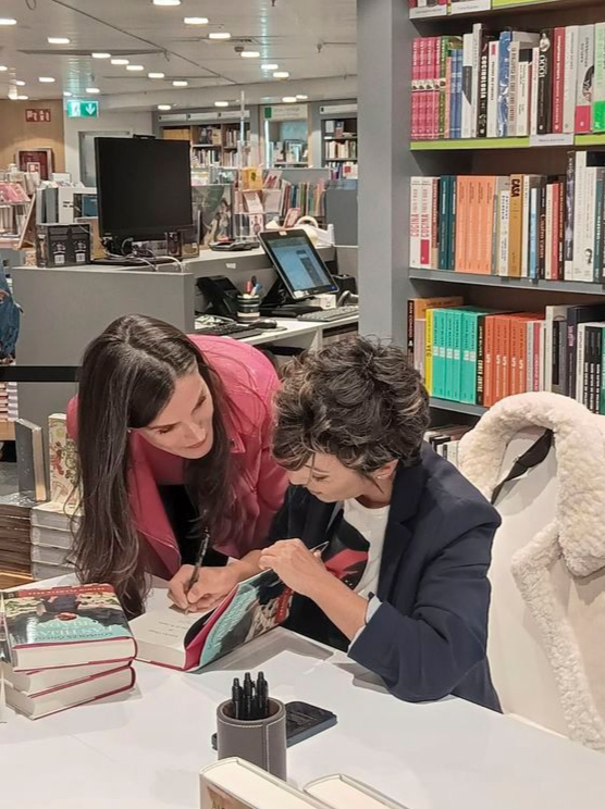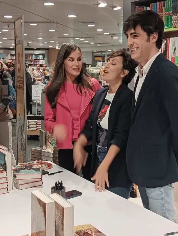 西班牙王后也追星,排队40多分钟支持好朋友松索莱斯的书籍签售会,穿着红色皮衣人群中成焦点,活动现场亲民又接地气,购买了书还找作者签名呢!