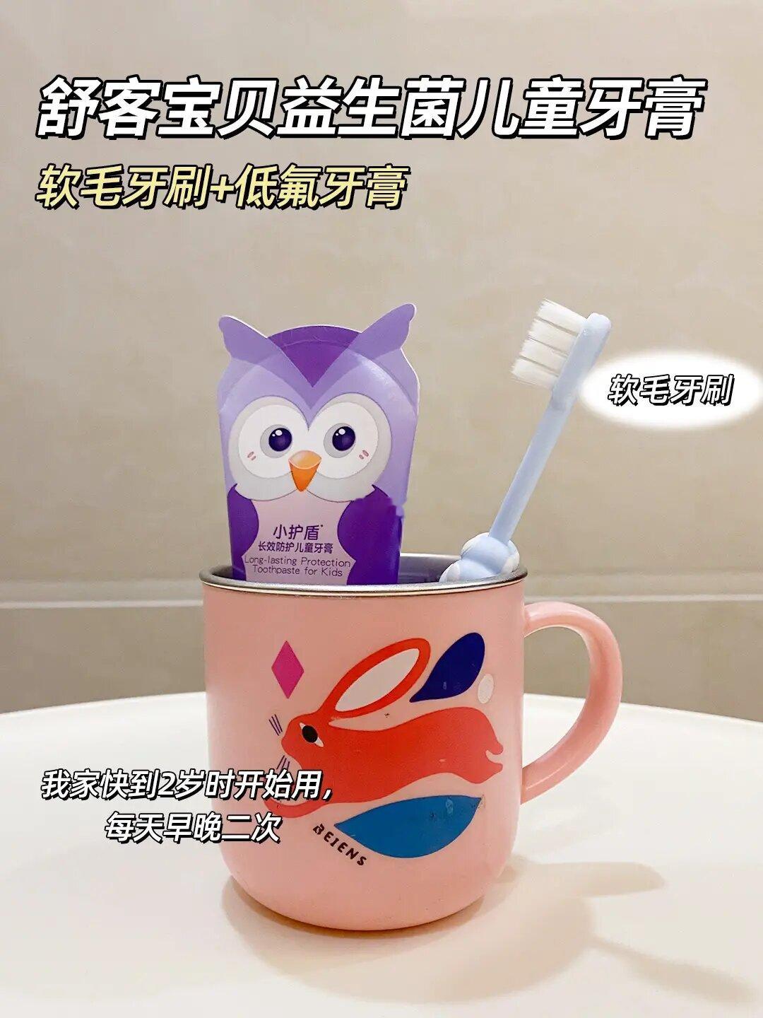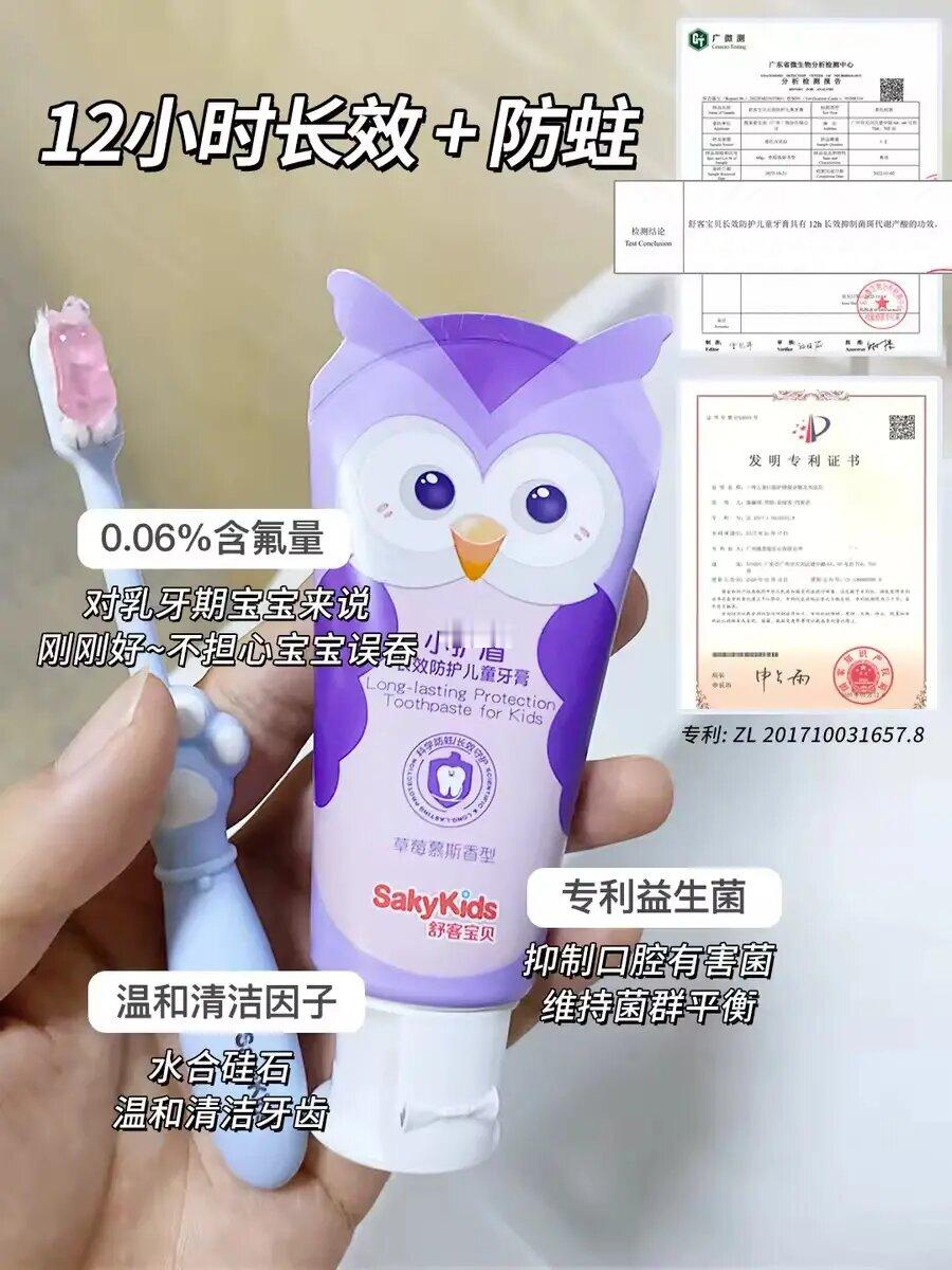 💫像我家现在用的这款舒客宝贝益生菌儿童牙膏,是可以12小时长效防蛀的。里面含有专利益生菌(中国发明专利:ZL 201710031657.8),不仅可以对氟起到加固作用,还能快速覆盖吸附牙齿上的有害菌,在孩子刷牙漱口的时候就能打包带出口腔。舒客宝贝是专注儿童口腔护理十几年的国货大牌了,牙膏也是特别邀请专家定制的三段分龄含氟。2-5岁这款0.06%氟既能有效防蛀,又不担心宝宝误吞,温和守护宝宝牙齿。味道是淡淡的草莓慕斯味,宝宝接受度高,如果你家宝宝是刷牙困难户,这个舒客儿童牙膏,真建议试一试!
