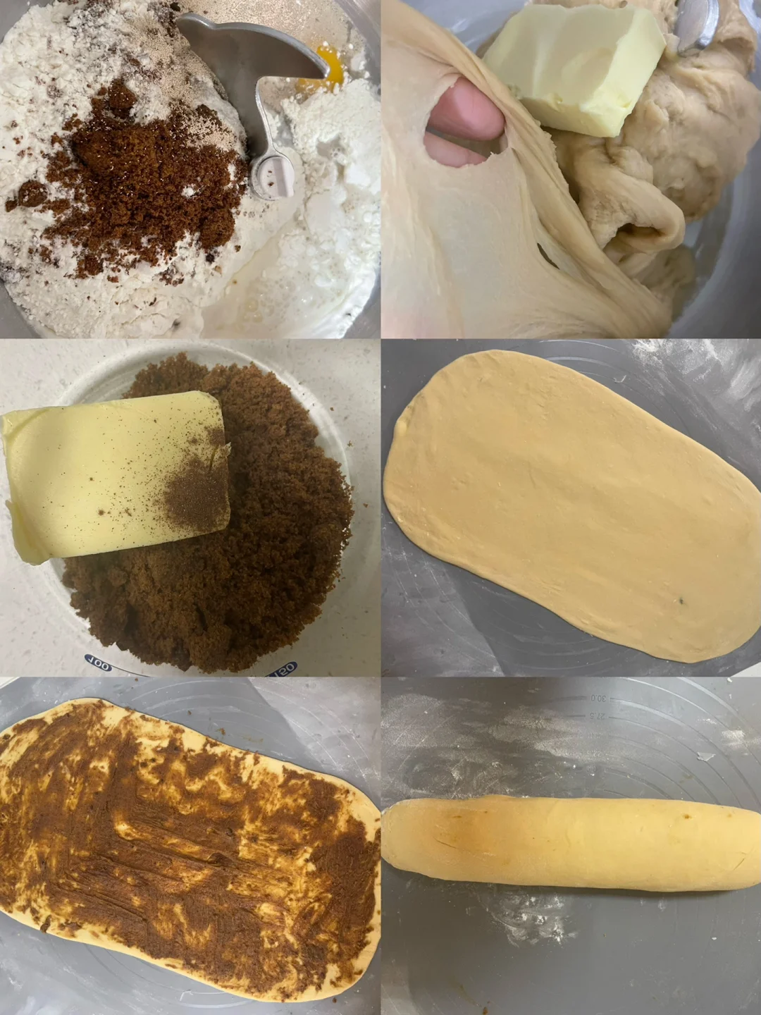 🍂馋了好久的肉桂卷,终于安排啦!不需要手套膜!出炉时满屋都是香甜的味道! 【所需食材】 🍂面团部分 高筋面粉300克|红糖35克|水140克|全蛋液50克|干酵母粉3克|盐2克|无盐黄油20克 🍂馅料部分 黄油40克|红糖40克|肉桂粉2克 【制作过程】 1⃣️除黄油之外的面团材料揉到后膜加入软化黄油继续揉均匀 2⃣️揉好的面团擀开成长方形,均匀涂抹馅料,卷起,捏紧收口,切成9份 3⃣️发酵至体积1.5倍大,180度烘烤18分钟左右 🔗馅料做法 软化黄油加入红糖和肉桂粉混合均匀即可