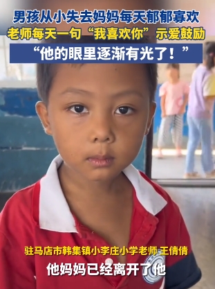 “这个老师火了!”河南驻马店,男孩从小失去妈妈,每天郁郁寡欢!老师非常心疼,坚持每天对男孩说一句“我喜欢你”示爱鼓励,让男孩的眼里重新有了光!网友:这样的老师才是合格的,而不是看你成绩差,你家穷,就欺负你,孤立你! 原来,倩倩老师在农村教书,班上的学生家里条件都不怎么样。而倩倩老师接管这个班级后,发现学生张宝龙特别不一样!(来源:洪观新闻) 河南驻马店的一位老师因每天对一个失去妈妈的男孩说一句“我喜欢你”而走红。这个男孩每天郁郁寡欢,老师非常心疼他,通过每天对他表达爱意和鼓励,让他的眼中重新有了光。