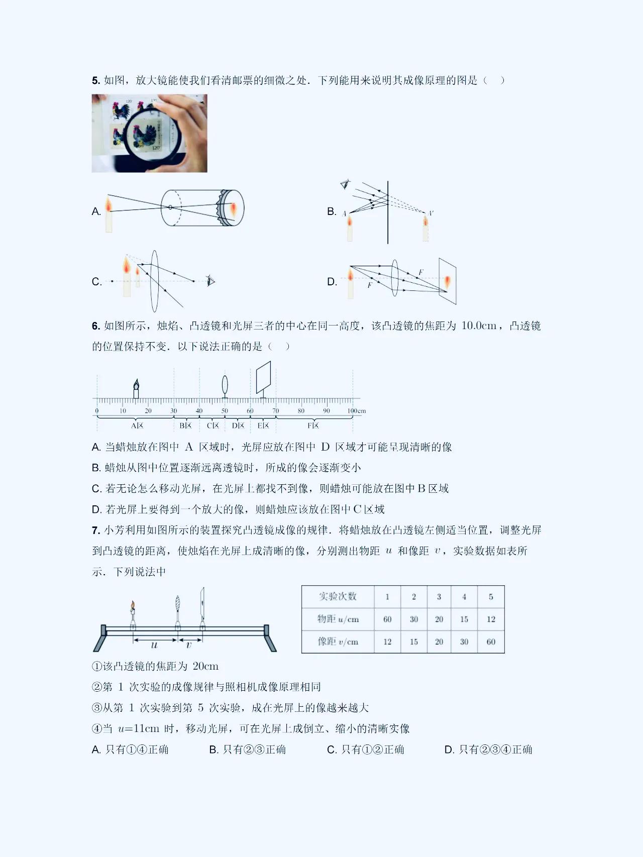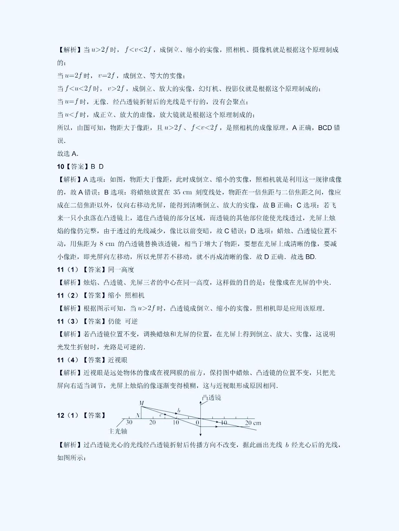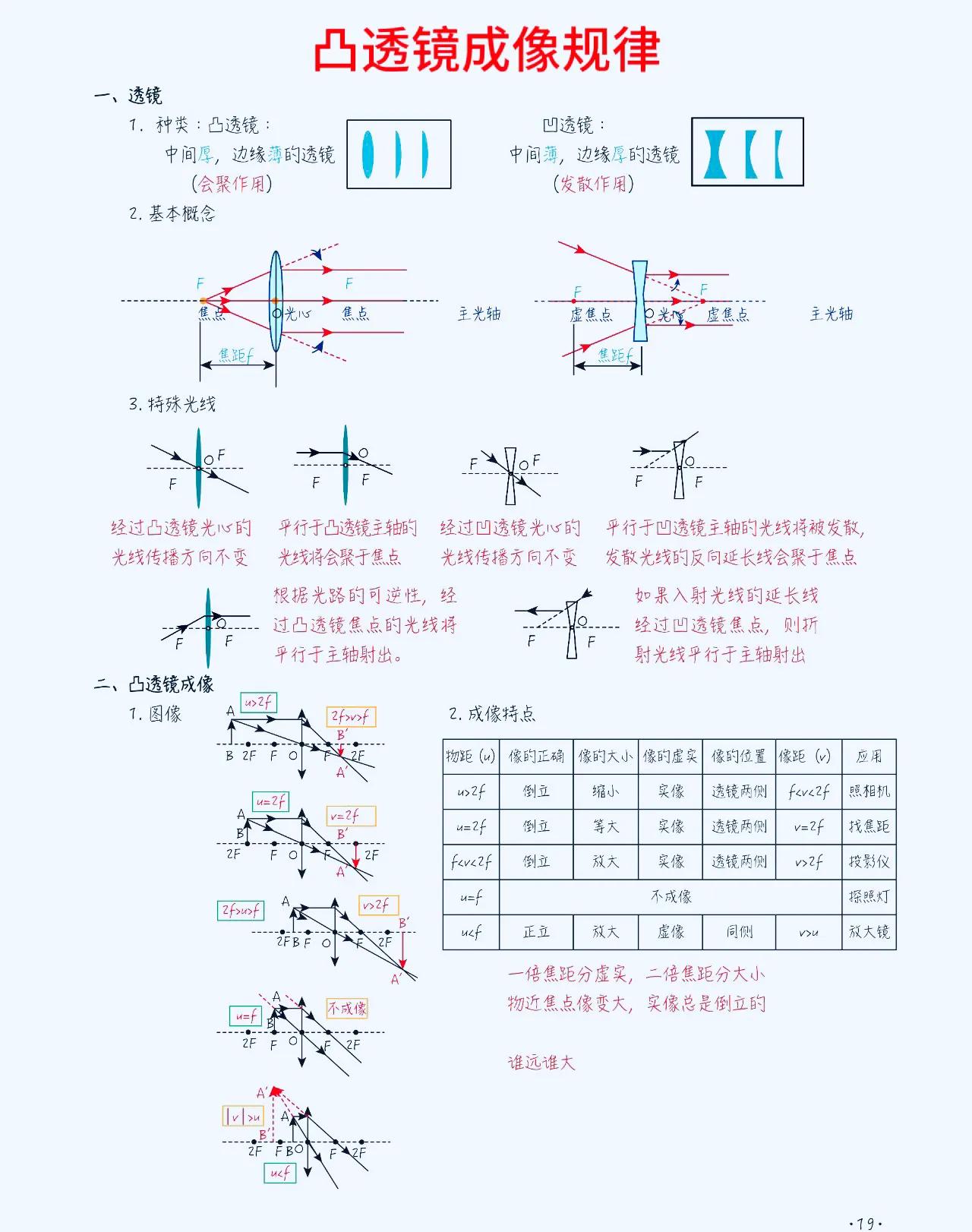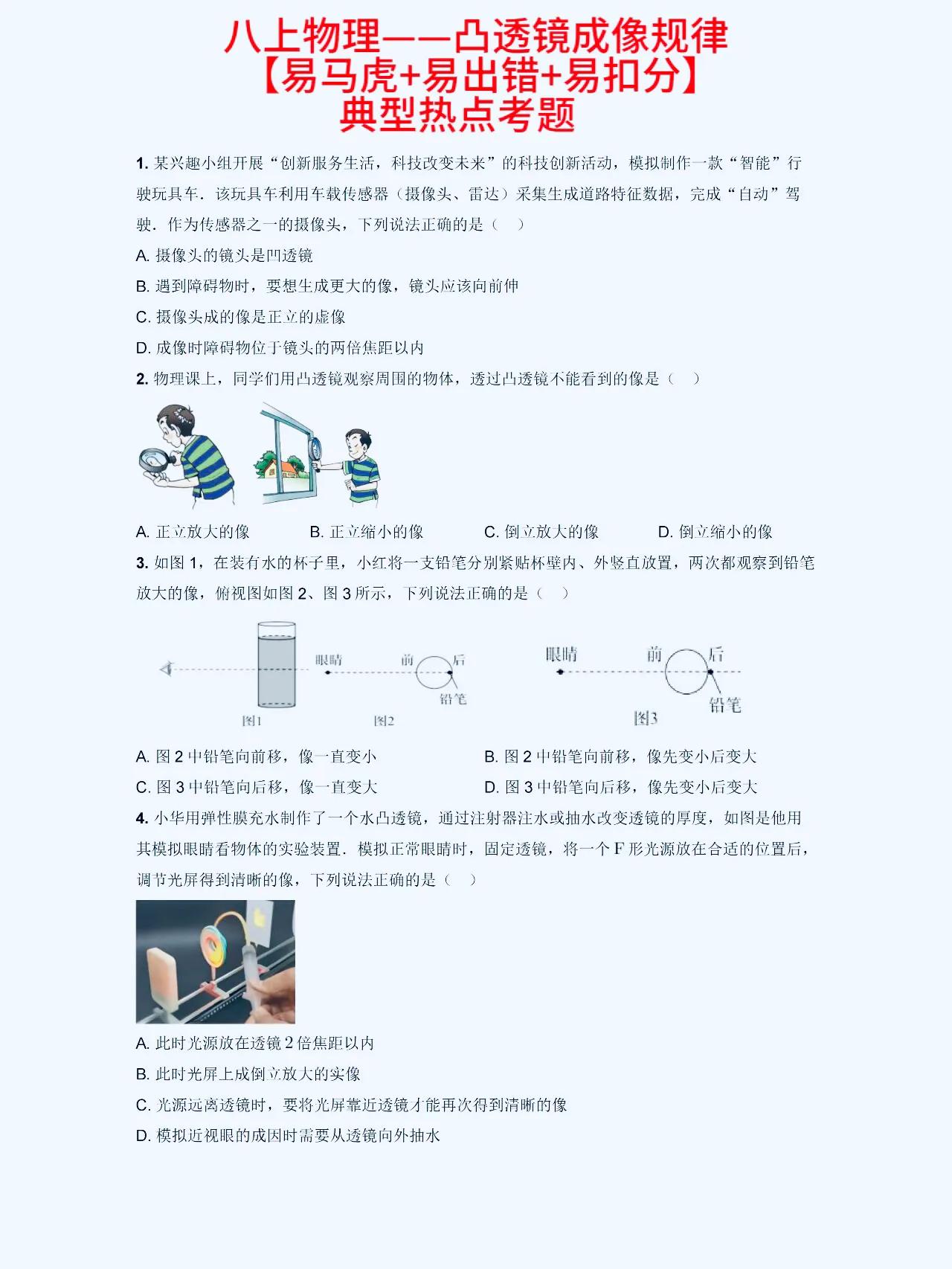 八上物理【凸透镜成像】解题规律 在初中物理学习中,凸透镜和凹透镜是经常出错,易混淆,马虎的一个题型。 它们的成像性质和规律有着一定的特点,这方面比较弱的,这套解题方面的思路,技巧,以及常考的热点,课内外重难点考题,发给大家。 1、凸透镜成像性质: 凸透镜成像时,平行光线经过透镜后会会聚到焦点。而且,在凸透镜的焦点之后放置物体,光线会经过透镜后呈现向后延伸的方向,从而形成虚像。这是凸透镜成像的基本性质。 2、成像规律总结: 根据物距、像距以及透镜的焦距的数值关系,我们可以总结出成像规律:当物距大于焦距时,透镜成像会在焦点处形成实像;当物距小于焦距时,透镜成像会在焦点处形成虚像。 #初中物理#初二物理#凸透镜成像规律#八上物理 #初二上册物理期末复习