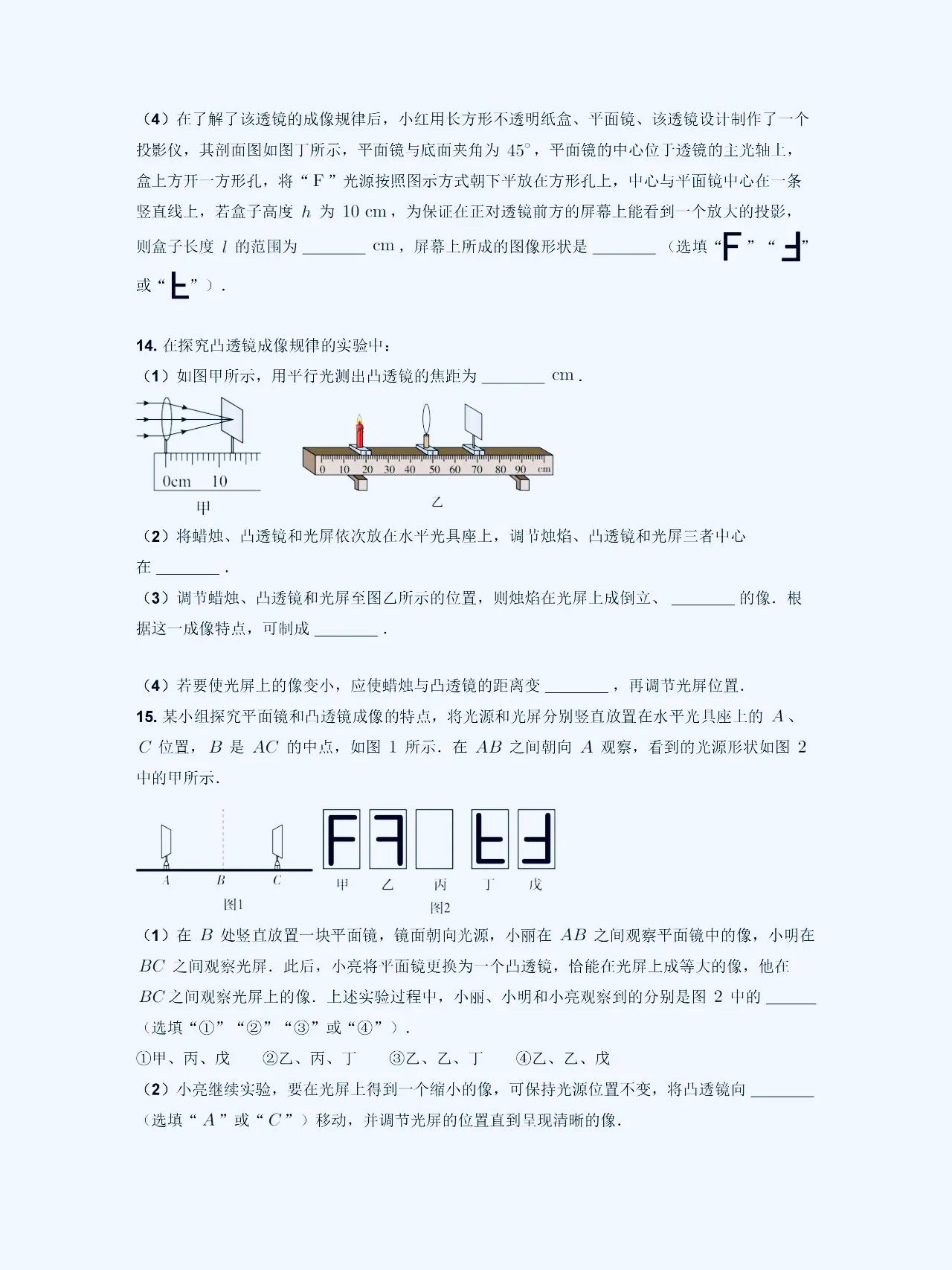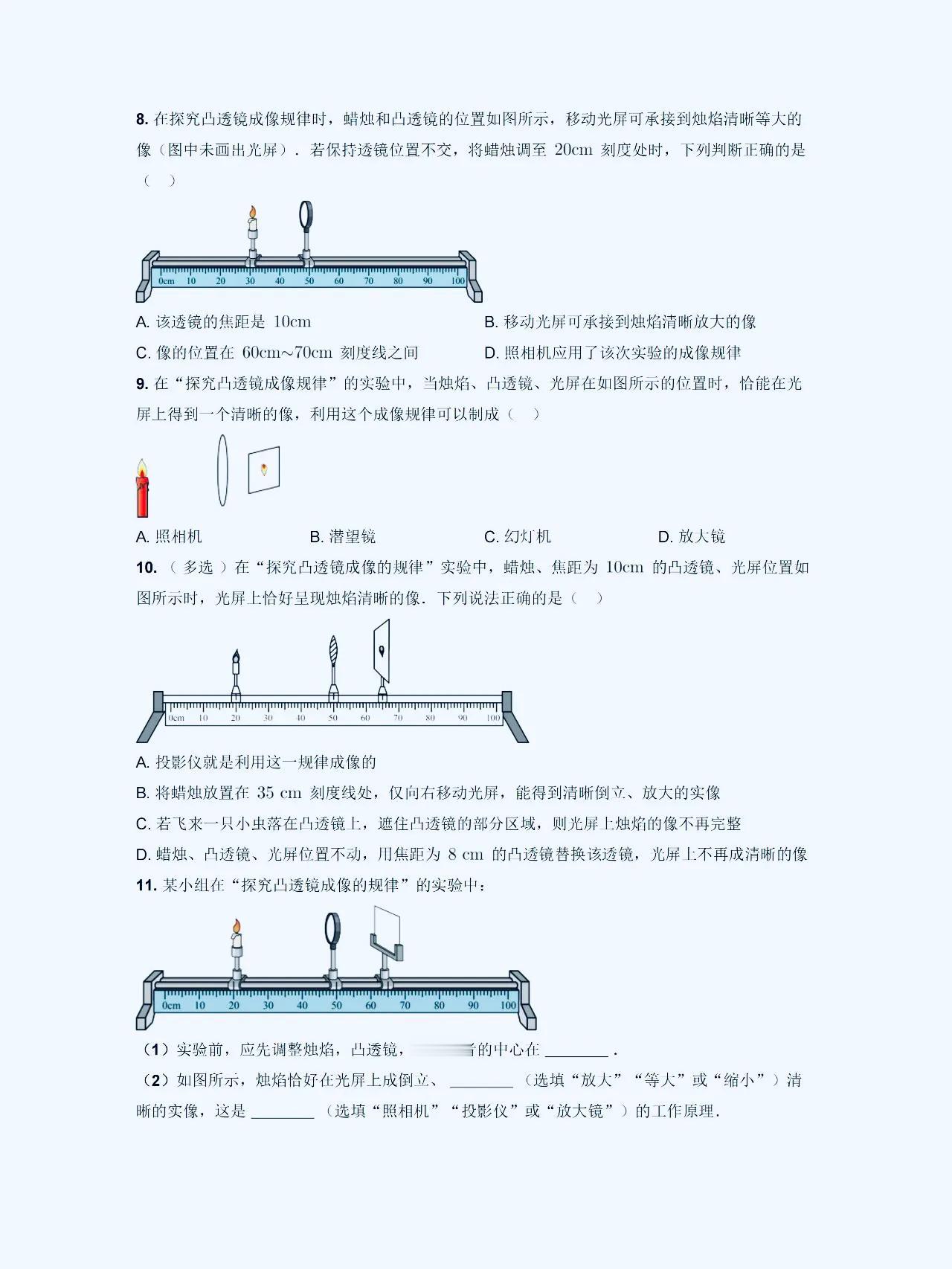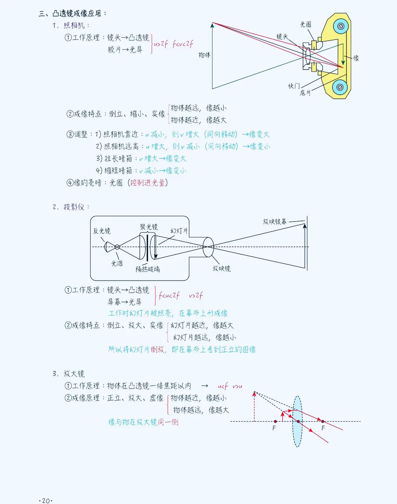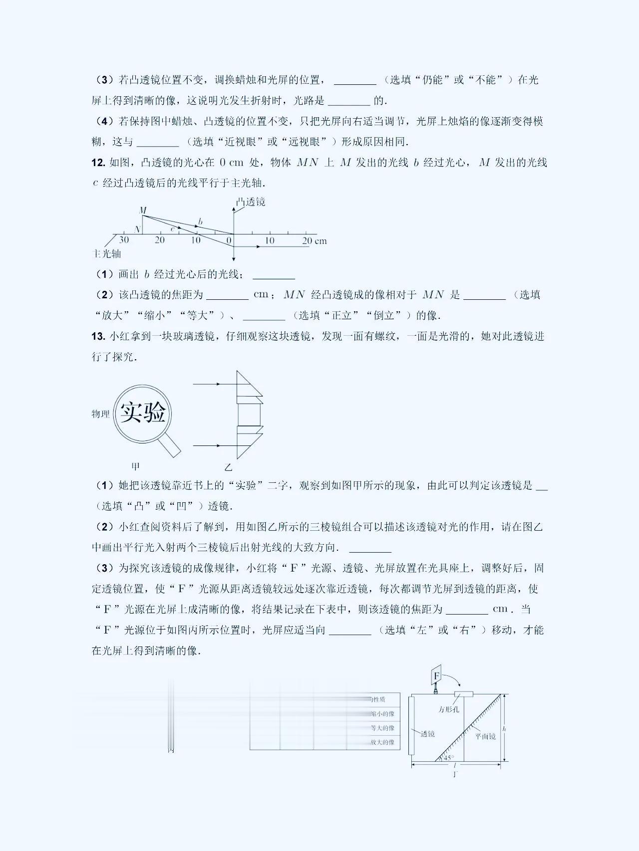 八上物理【凸透镜成像】解题规律 在初中物理学习中,凸透镜和凹透镜是经常出错,易混淆,马虎的一个题型。 它们的成像性质和规律有着一定的特点,这方面比较弱的,这套解题方面的思路,技巧,以及常考的热点,课内外重难点考题,发给大家。 1、凸透镜成像性质: 凸透镜成像时,平行光线经过透镜后会会聚到焦点。而且,在凸透镜的焦点之后放置物体,光线会经过透镜后呈现向后延伸的方向,从而形成虚像。这是凸透镜成像的基本性质。 2、成像规律总结: 根据物距、像距以及透镜的焦距的数值关系,我们可以总结出成像规律:当物距大于焦距时,透镜成像会在焦点处形成实像;当物距小于焦距时,透镜成像会在焦点处形成虚像。 #初中物理#初二物理#凸透镜成像规律#八上物理 #初二上册物理期末复习