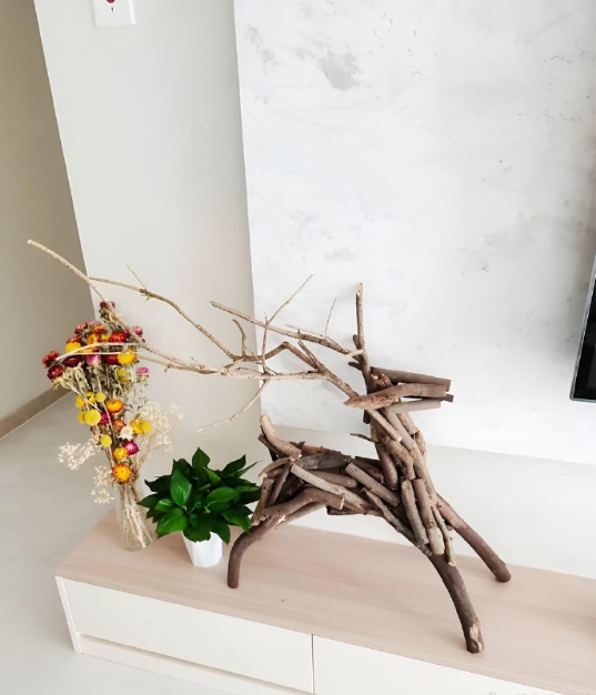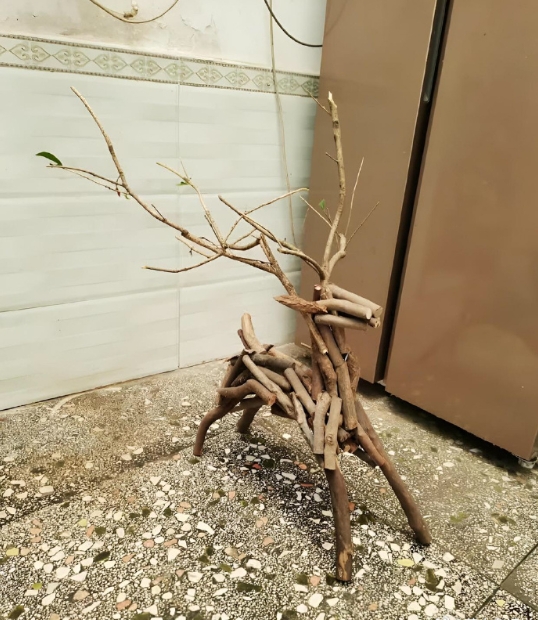 真的很有才华, 他用外面捡到的树枝做了一只鹿。