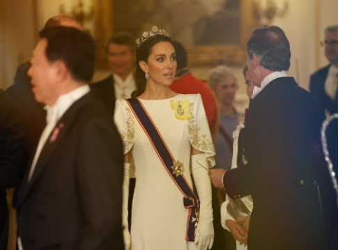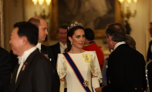凯特王妃接见韩国第一夫人,解锁新造型又美又少女,据悉凯特王妃这次新解锁伊丽莎白王太后的斯特拉斯莫尔玫瑰王冠,虽然很小但是非常好看,头饰上设计有五朵玫瑰花,均可拆卸以用作胸针,并镶有玫瑰切割的钻石,另外还搭配了女王的钻石耳坠。