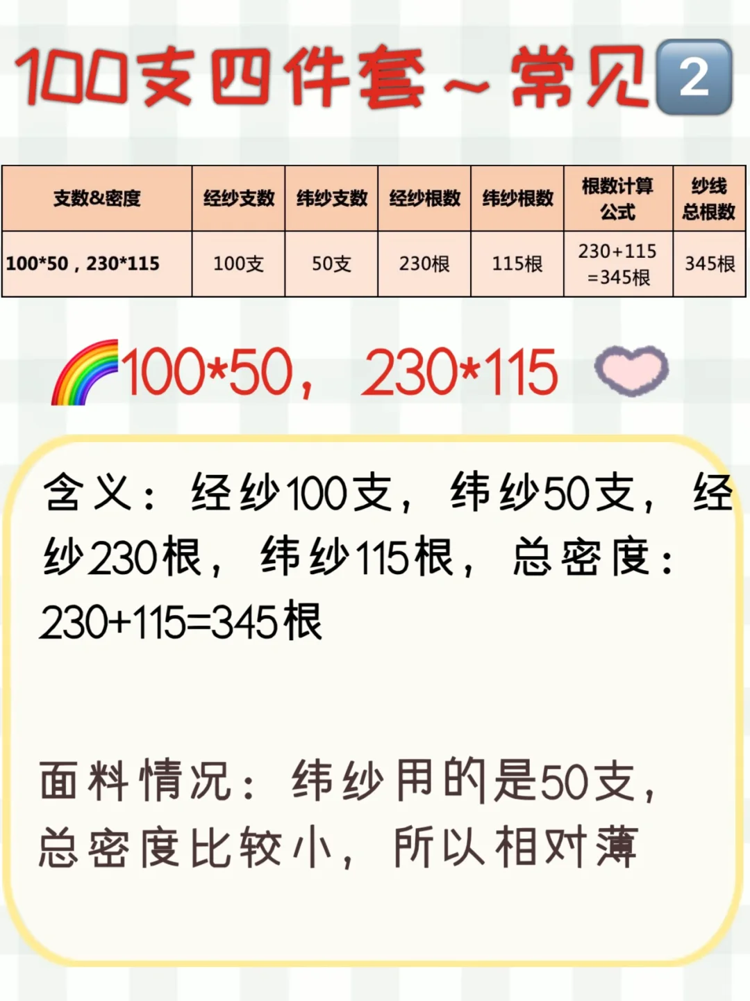 含义:经纱100支,纬纱50支,经纱230根,纬纱115根,总密度:230+115=345根