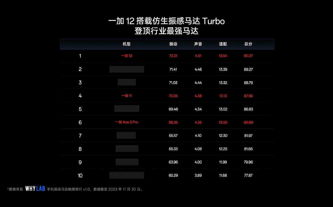 这就尴尬了,魅族21发布会吹了半小时的马达,体验居然还不是最强的?一加这波真的遥遥领先啊! 刚看到有博主做了手机振动马达的触感排行榜,魅族21只能排到第三名,第二名是iPhone 15 Pro Max,而即将发布的一加12,振动马达的触感排名第一,确实是有点东西的。一加也是直言:在马达体验方面能超越一加的,只有一加自己。 再加上骁龙8G3、2K屏、光喻LYT-808主摄、OV64B潜望长焦、100W+50W闪充以及5400mAh电池等配置,一加12配置基本是挑不出什么毛病了,就等一个价格了!
