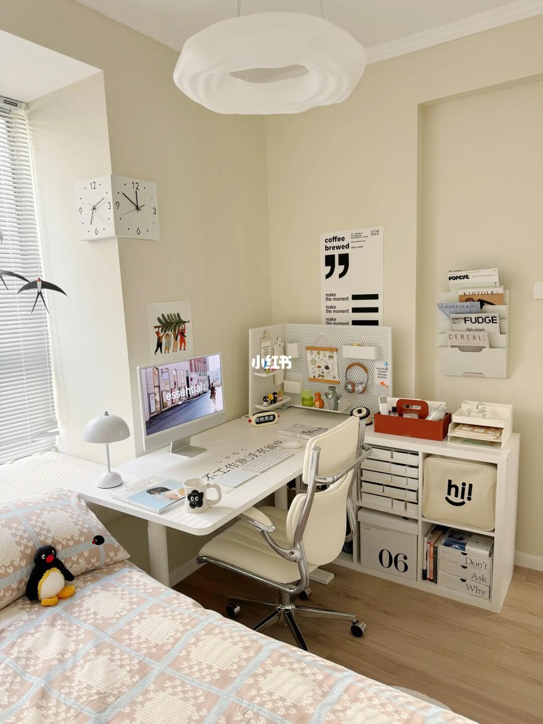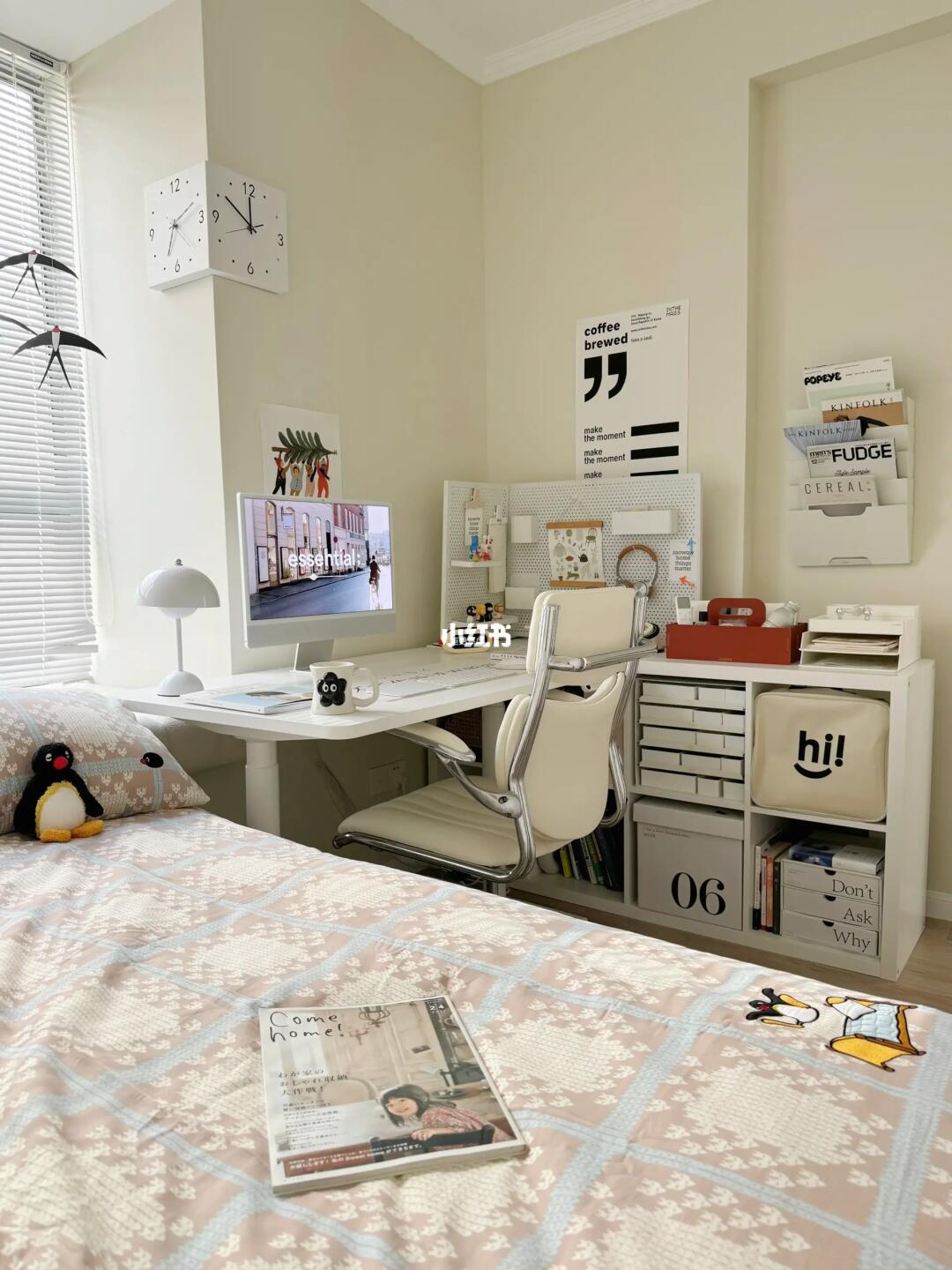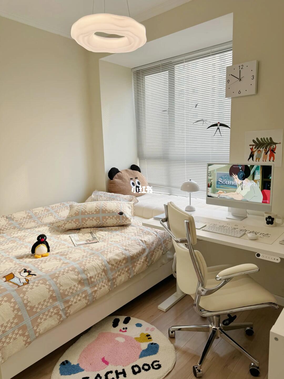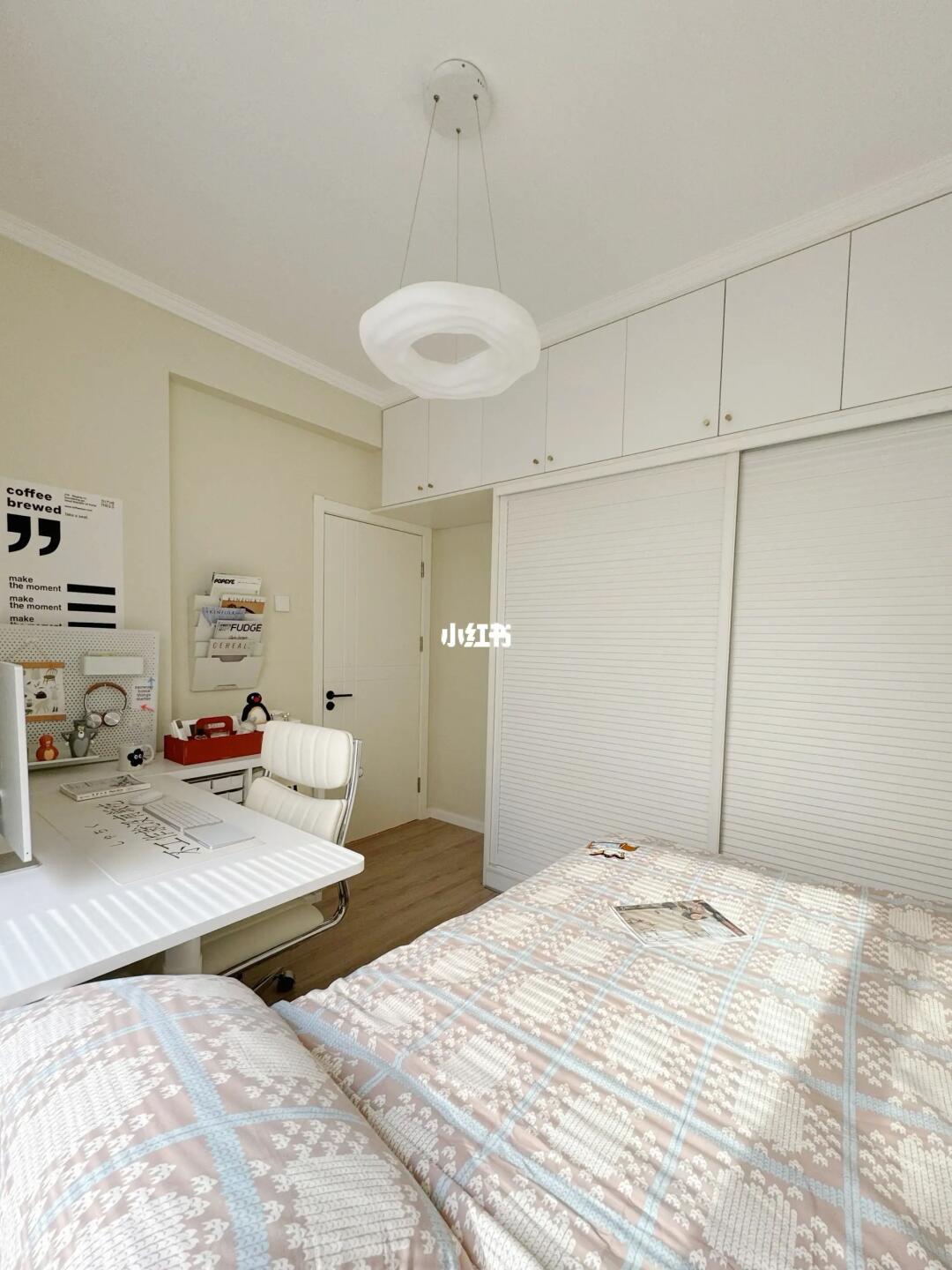 我的卧室只有8平米 装修时都劝我做榻榻米 可做了以后就不好变动了 于是没听劝 硬装就简简单单 墙面刷奶油色乳胶漆 地面铺地板 让木工做了一面墙的衣柜 装了曲奇吊灯 打开后房间明亮温馨 合理布局后 放下了1.5m床 大大的转角书桌 好看又实用 超爱宅在这样的小房间 在书桌听听音乐追追剧 坐飘窗垫上看看书发发呆 我的房间虽小 但住起来也挺舒服~ -