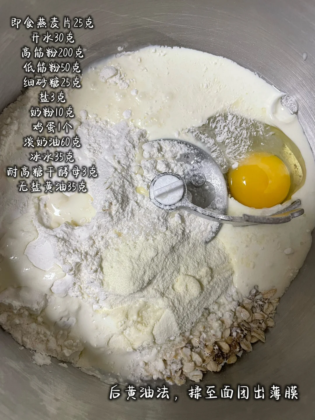 - 配方来自,感谢!配方很棒! - 烤好的面包表皮脆脆的,组织松软好化口!根本吃不出来麦片粗颗粒感! - 麦片是即食麦片! - 【所需食材】 即食燕麦片25克|开水30克(这两样需先混合充分浸泡晾凉) 高筋粉200克|低筋粉50克|细砂糖25克|盐3克|奶粉10克|鸡蛋1个|淡奶油60克|冰水35克|耐高糖干酵母3克|无盐黄油35克 【烘烤温度】 200度15分钟