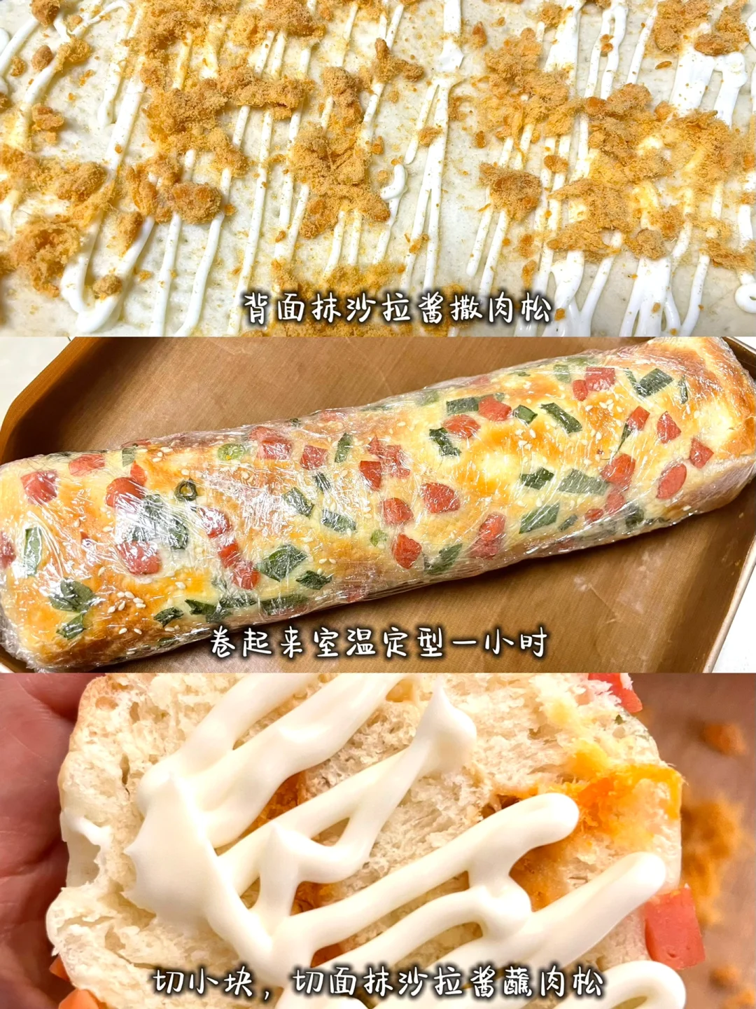 7⃣️烤好的面包立即从烤盘取出,翻过来,背面涂抹沙拉酱撒肉松,趁温热卷起来