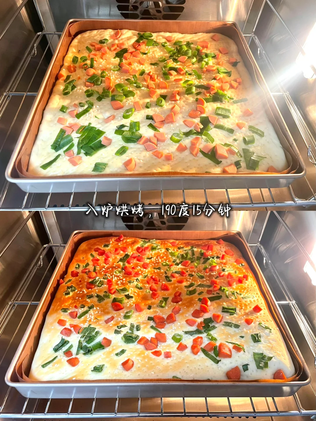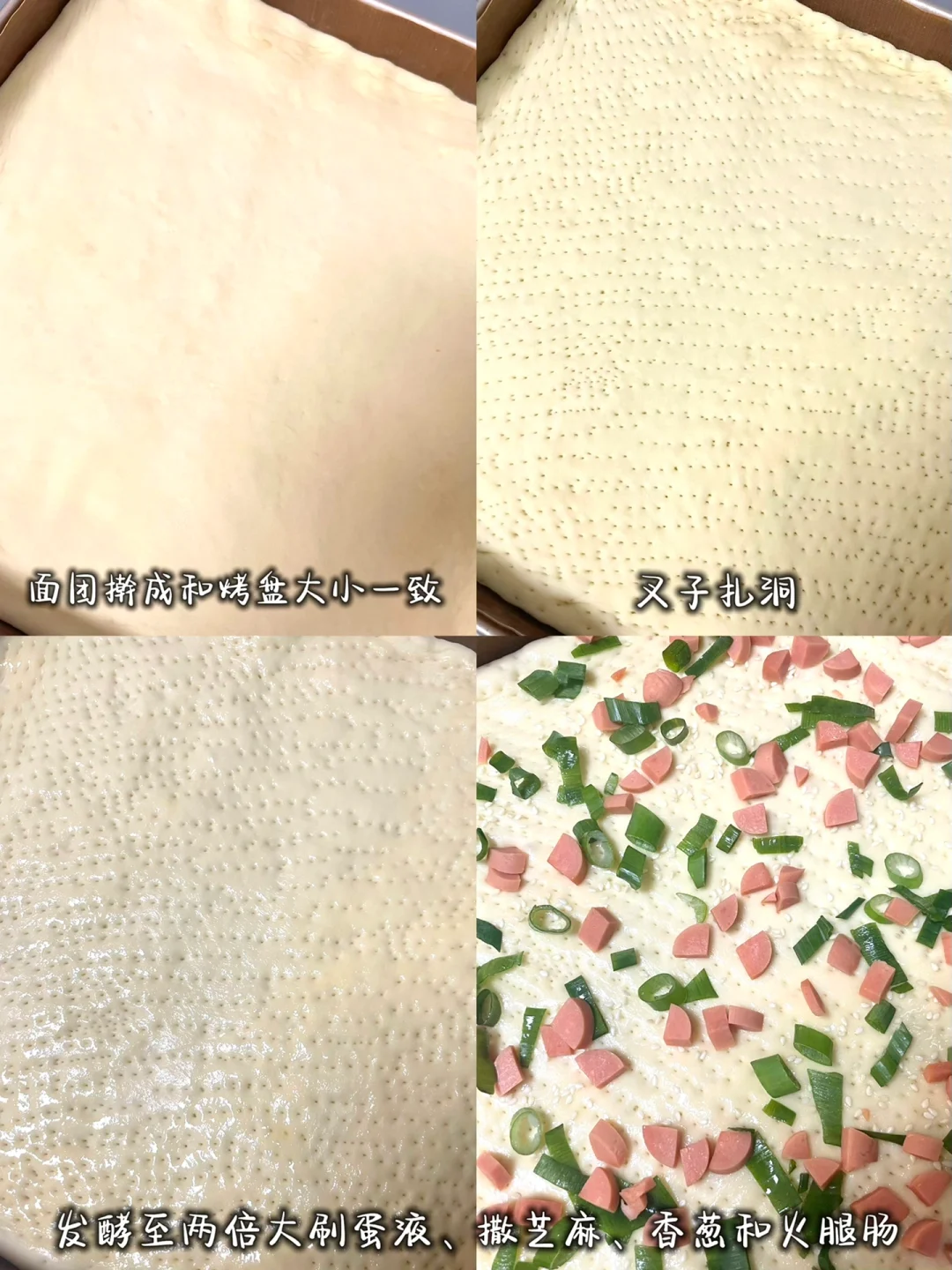 3⃣️发酵好的面团按压排气,擀成和烤盘尺寸一致的正方形