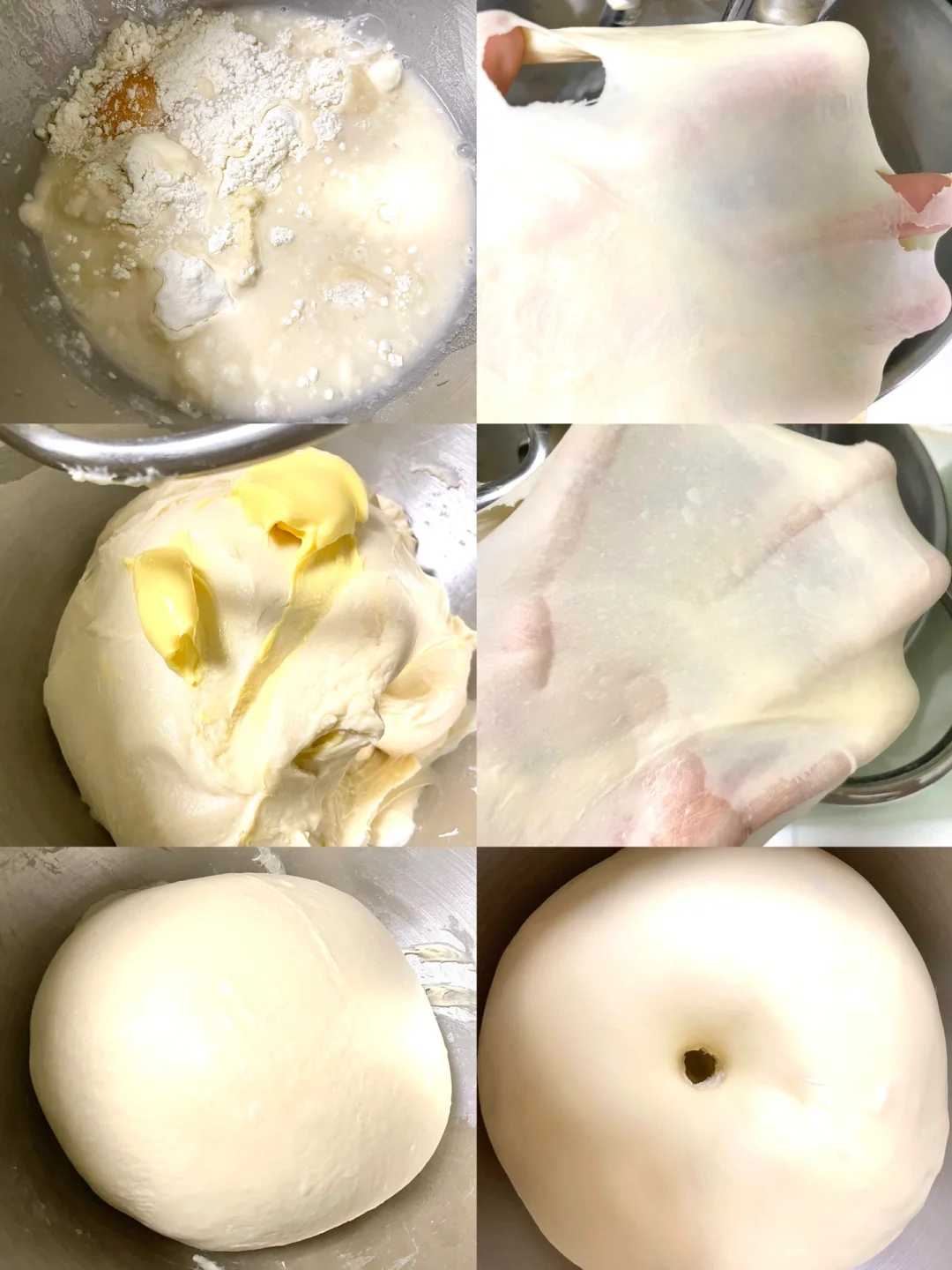 1⃣️除了黄油之外的所有面团材料揉至粗膜后加入黄油揉出手套膜