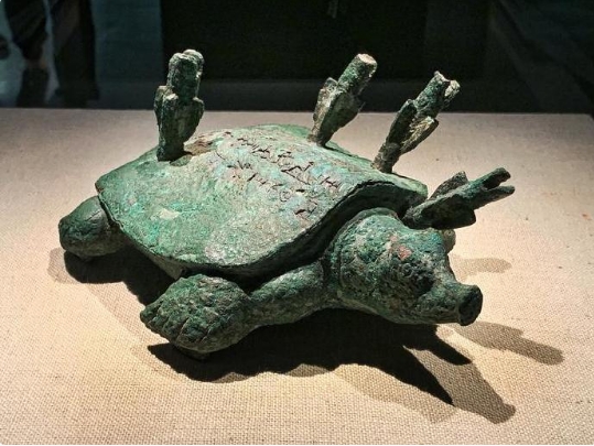 作册般鼋,大约3100年前商纣王帝辛和作册官(史官)般在安阳洹河边看到大鼋一只,帝辛射了一箭,接着让般射了三箭,全部命中,帝辛很高兴,认为此乃吉兆,让般回去把这做成青铜器供奉。大概随后此物随葬于般,但被人盗墓挖掘后再次遗落于洹河……机缘巧合,据说90年代一老伯钓起了这只铜鼋,并成为我国国家博物馆的珍贵馆藏