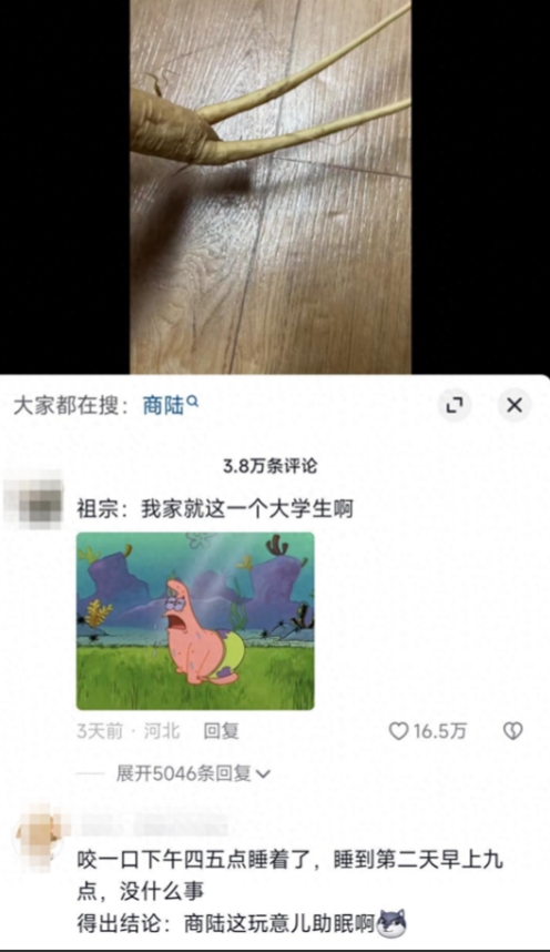 咬一口“人参”昏睡17个小时!一女大学生在学校松树林挖到一颗“人参”,出于好奇尝了一口,竟然从下午的四五点,直接睡到第二天的上午九点才醒(有没有可能是昏迷[捂脸])。 之后,,他将这件事分享到网上:这玩意助眠!17个小时深度睡眠!失眠党福音! 这可把网友们急疯了,纷纷留言劝阻:这是“商陆”有剧毒,神农尝百草吃的最后一个就是它! 女大学生小张是一名土生土长的中国学生,家庭条件较好,高中毕业后被父母送到韩国留学。初到韩国,一切对小张来说都很陌生,由于语言障碍和文化差异,除了几个中国同学,她几乎没有其他朋友。 一天,在繁重的课业和考试压力下,小张决定去学校后操场散心,这是她少有的放松时间。操场边上有一大片茂密的松树林,树林很安静,只有几个学生在遛弯或看书。 小张来到一棵大树下,无意中看到树边生长着一株形状酷似人参的植物。细看下发现这株植物与人参极为相似,有细长的主根和多条支根。她曾经了解过人参的功效,知道它对身体有益,能提高免疫力、增加体力等。 那一刻,小张脑海中闪过挖起这株“人参”带回宿舍品尝的念头,她环顾四周,树林里只有几个学生在远处,似乎都没有注意这里。 小张在周围捡了一根细木棍,小心翼翼地把“人参”的根系从土壤里挖出来,然后她迅速把“人参”和书包一起带回了宿舍。 一个同学见她捧着一株植物进门,好奇地问是什么,小张兴奋地说这是人参,准备晚些尝一尝。那位同学虽然感到有些奇怪,但也没有过多过问。 下午时间尚早,小张将那株“人参”洗净,心急火燎地准备品尝,她回想起中医说过野生人参比人工栽培的更加珍贵,富含药效。一想到这可能是名副其实的高级补品,小张更加跃跃欲试,拿起菜刀切下一小段,放入口中咀嚼。 那味道很涩很苦,但小张还是咽了下去,她想到刚出土的人参也许会有泥土的气味,等清洗干净了应该会好很多。就在这时,一股强烈的困意突然袭来。 小张看了眼时间,才下午四点,平日这个时候她根本不会犯困,但今天实在抵挡不住,她决定躺一会,很快就进入了深度睡眠。 再醒来已经是第二天上午,小张惊恐地发现自己整整睡了十七个小时!室友说无论怎么叫她都没有反应,深度睡眠就像进入了重度昏迷。 小张疑惑不已,明明自己身体很好,怎会突然睡那么久。这时她看到桌上的“人参”,脑海中闪过一个念头:莫非是这东西的问题? 为弄清真相,小张将“人参”的图片发到网上征求意见,很快,一些网友回复说这不是人参,而是一种叫“商陆”的有毒植物! 根据专家介绍,商陆含有毒性成分,大量食用可出现多种中毒症状,严重可致死。小张顿时后怕不已,庆幸当时只吃了一小口,她立刻把剩下的部分扔掉,以防误伤。 这件事在网上引发热议,许多网友为小张担心,认为她太幸运了。也有人批评她鲁莽大意、妄自尝试不明植物。 中医药专家进一步解释了商陆的毒性机理,表示其主要成分可以生成组织胺等有害物质,导致呕吐、腹泻、心动过速、抽搐、昏迷等中毒反应,警告广大市民不要随意食用无法明确辨认的野生植物。 通过这个事件,我们再次意识到野外确实隐藏着一些外形无害而内里极度剧毒的植物。不熟悉这些植物的普通人,无论出于何种目的,都不应该鲁莽采食。否则一旦被毒害,后果不堪设想。