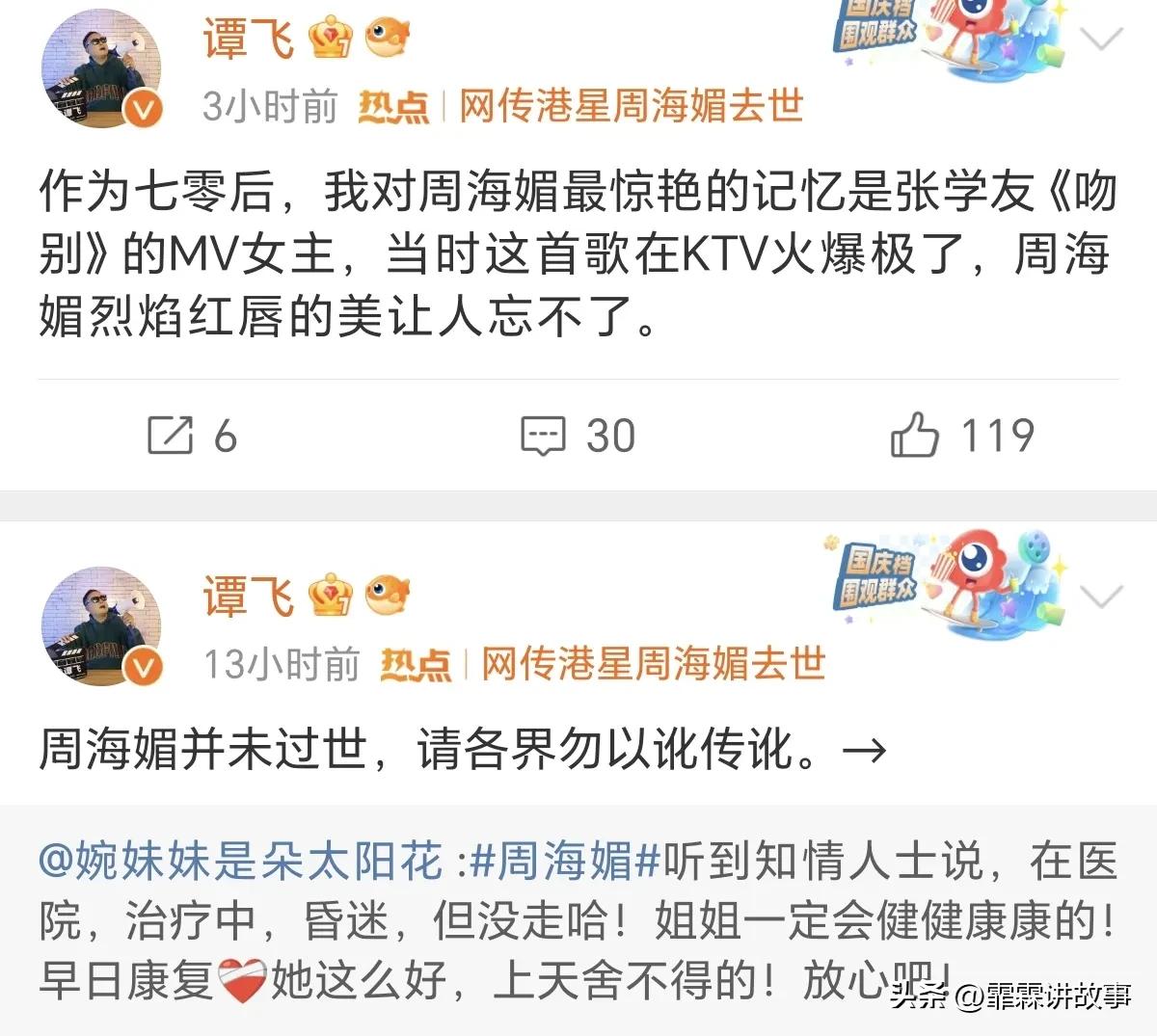 周海媚工作室发文周海媚走了,这真是令人难过的消息,今早我才看到谭飞的微博辟谣称她