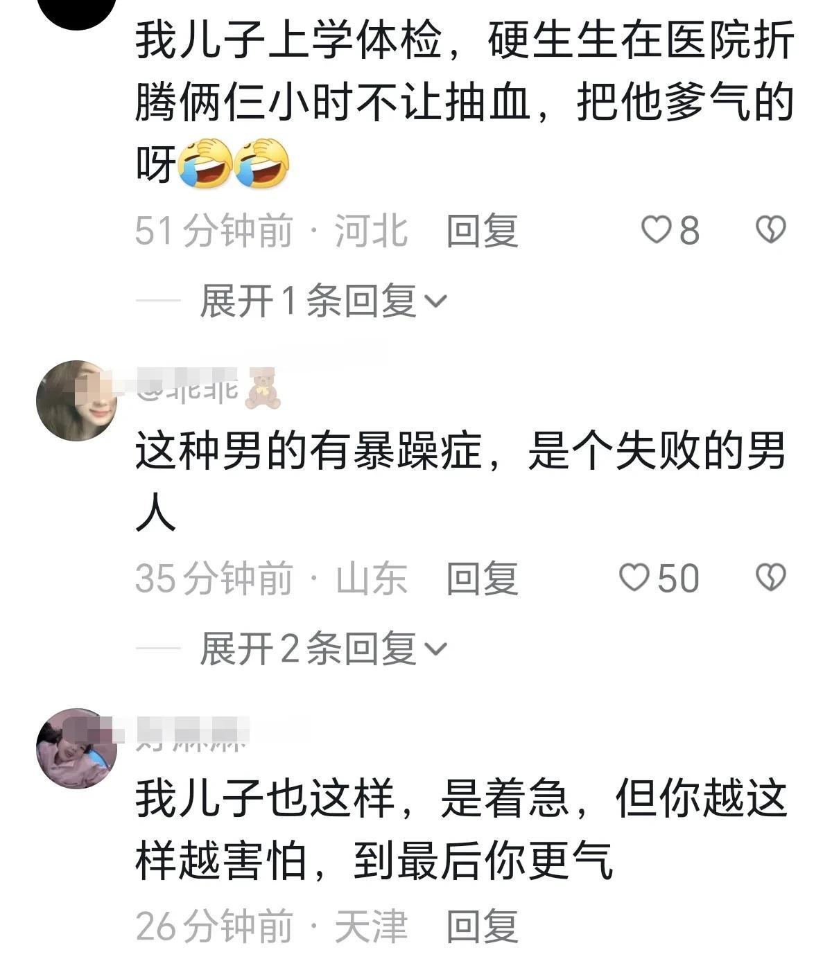孩子害怕打针,爸爸受不了,上去就是两脚,把坐在凳子上的儿子,踹倒在地,对此网友观点出现了两极分化。 网友:这个男的有暴躁症,是个失败的男人。 网友:我儿子上学体检,硬生生在医院折腾两三小时不让抽血,把他爹气的呀[捂脸][捂脸][捂脸] 网友:可以理解爸爸但是不认同他的做法。