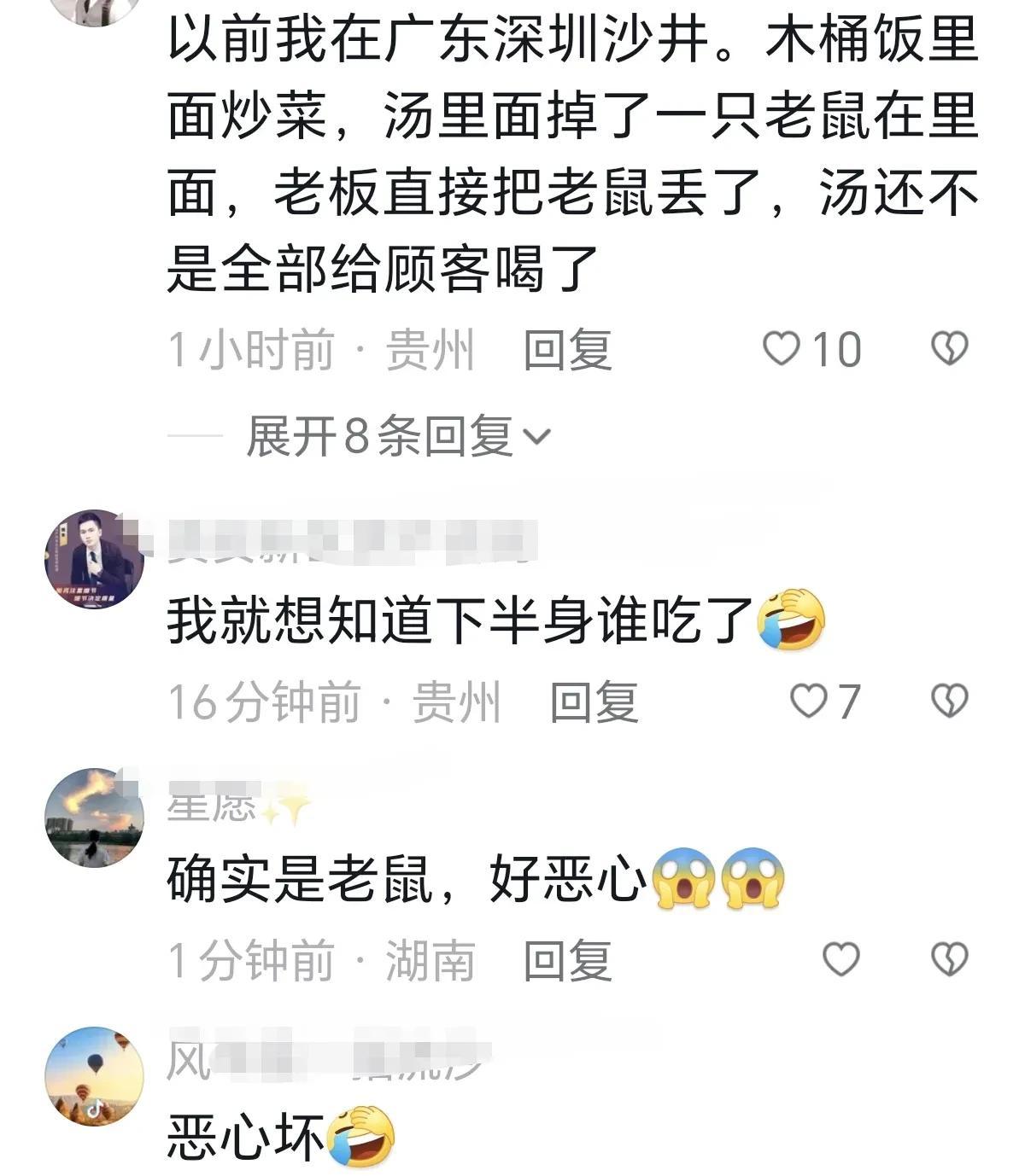 你敢相信么?近日江苏一男子点羊蝎子火锅外卖,竟然吃出来半截身子的老鼠,看到这画面真是叫人毛骨悚然啊!换作是我肚子里刚吃的都能吐出来。 店主回应:他就是要钱但是又不说要多少钱,还举报到工商局,工商也来人了,查不到监控,现在已经停业整顿,等待结果。 网友:以前我在广东深圳沙井,木桶饭里面炒菜,汤里面掉了一只老鼠在里面,老板直接把老鼠丢了,汤还不是全部给顾客喝了。 网友:我就想知道下半身谁吃了。
