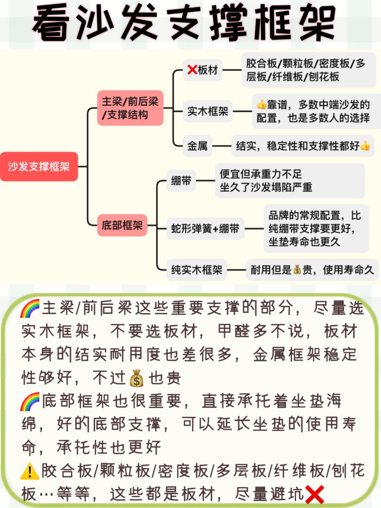🌈主梁/前后梁这些重要支撑的部分,尽量选实木框架,金属框架稳定性够好,不过💰也贵