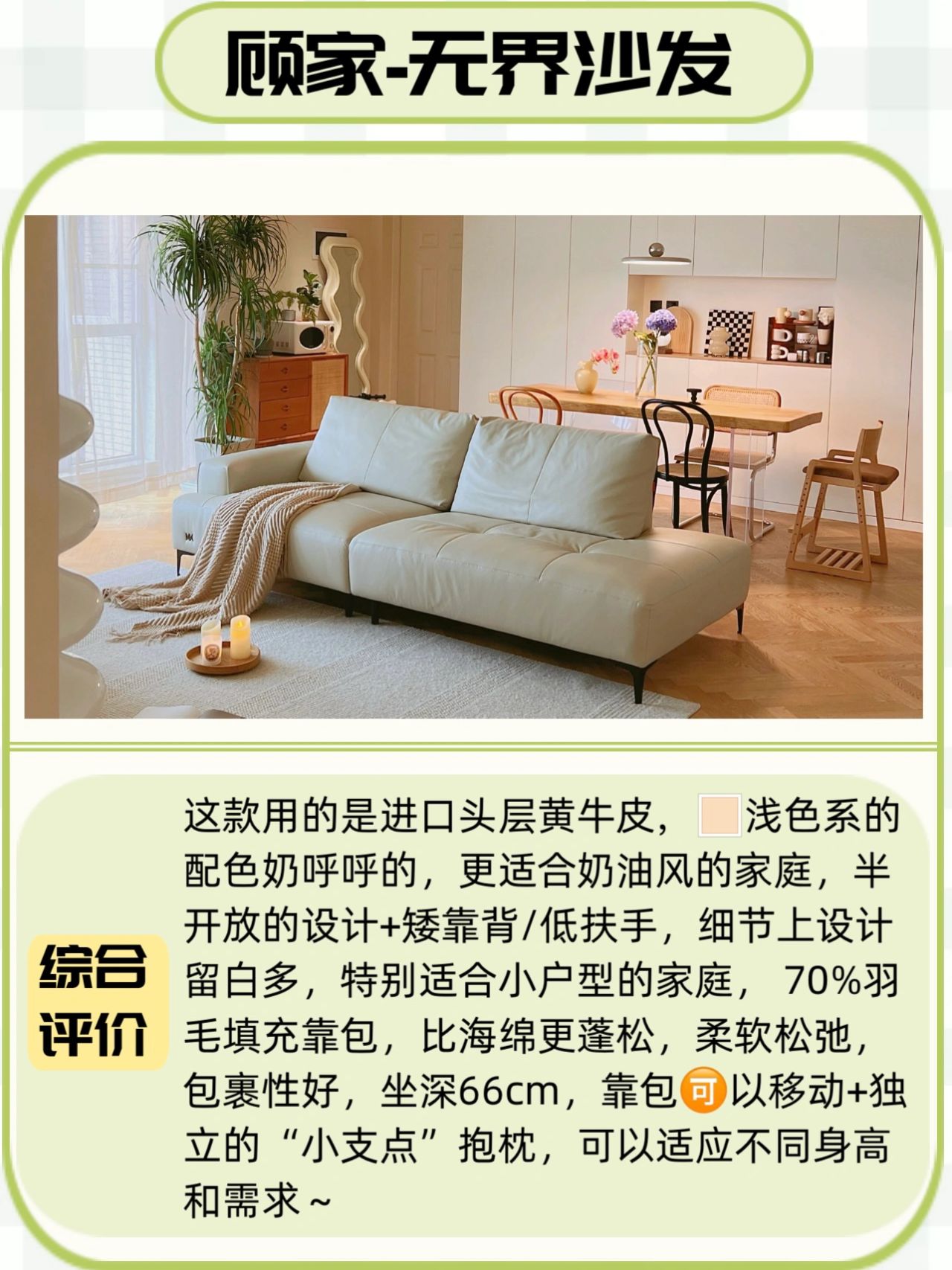 这款用的是进口头层黄牛皮,🏻浅色系的配色奶呼呼的,更适合奶油风的家庭,半开放的设计+矮靠背/低扶手,细节上设计留白多,特别适合小户型的家庭