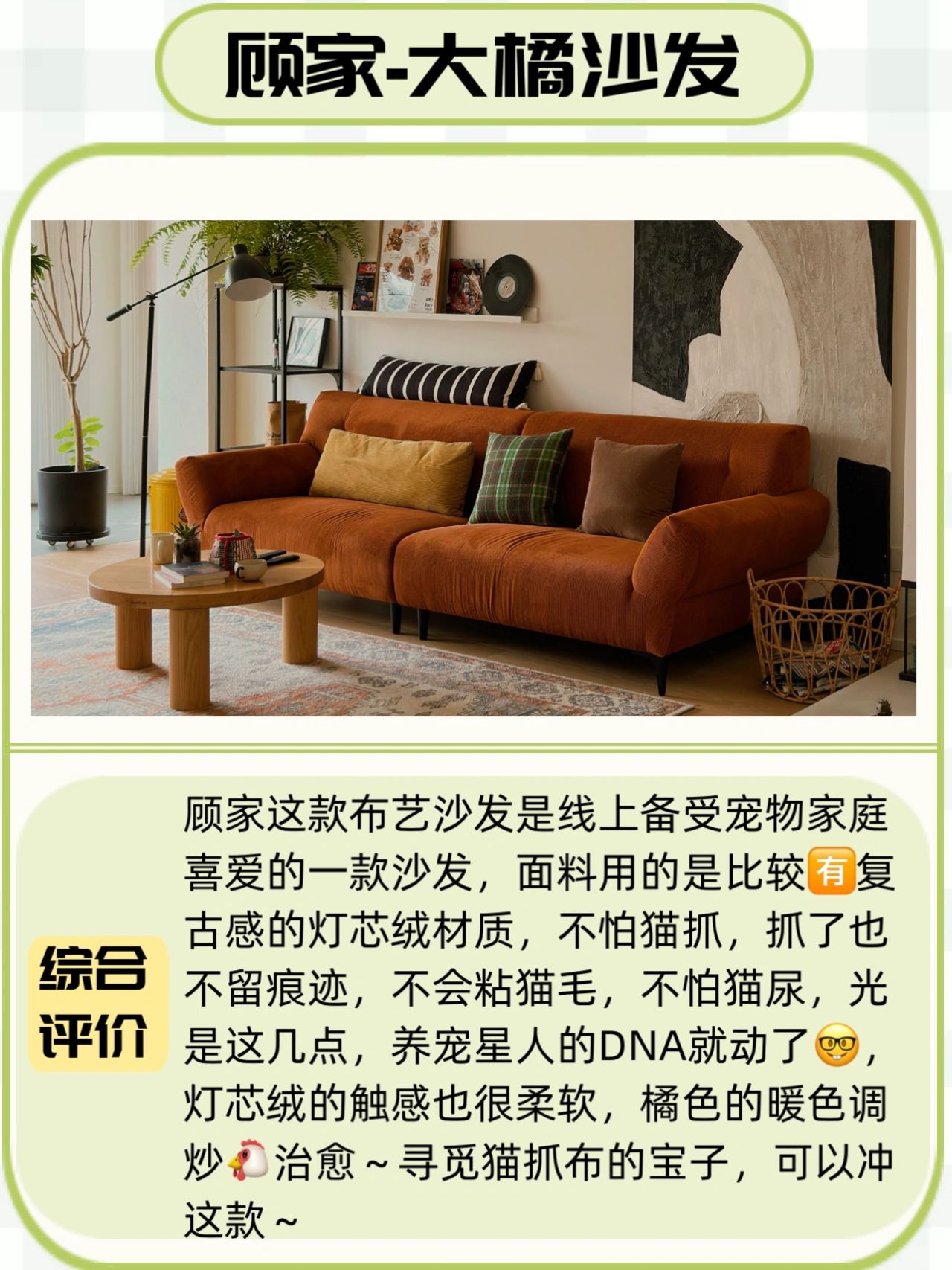 顾家这款布艺沙发是线上备受宠物家庭喜爱的一款沙发,面料用的是比较🈶️复古感的灯芯绒材质,不怕猫抓,抓了也不留痕迹,不会粘猫毛,不怕猫尿,光是这几点,养宠星人的DNA就动了🤓,灯芯绒的触感也很柔软,橘色的暖色调炒🐔治愈~寻觅猫抓布的宝子,可以冲这款