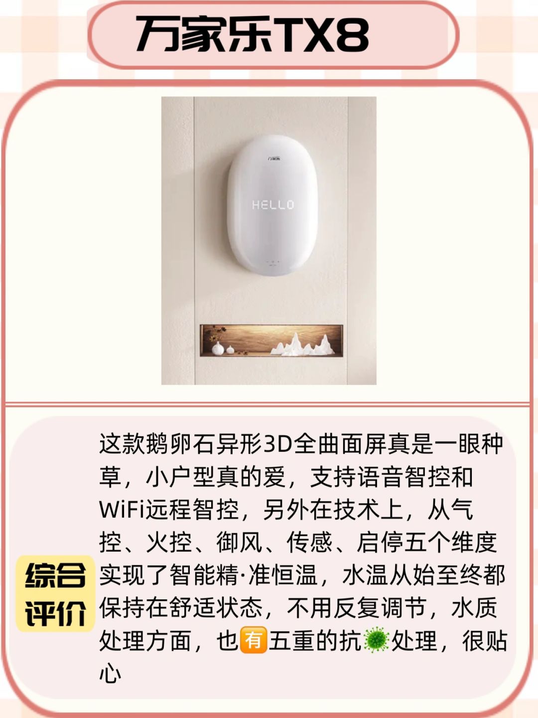 这款鹅卵石异形3D全曲面屏真是一眼种草,小户型真的爱,支持语音智控和WiFi远程智控,另外在技术上,从气控、火控、御风、传感、启停五个维度实现了智能精·准恒温,水温从始至终都保持在舒适状态,不用反复调节,水质处理方面,也🈶️五重的抗🦠处理,很贴心