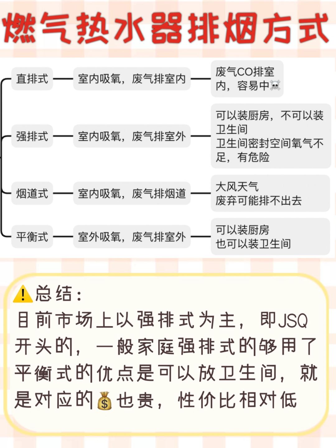 燃气热水器排烟方式有直排式、强排式、烟道式、平衡式四种,烟道式和直排式已经逐渐淘汰了,目前市面主流是强排式和平衡式,具体区别看图⬆️⬆️