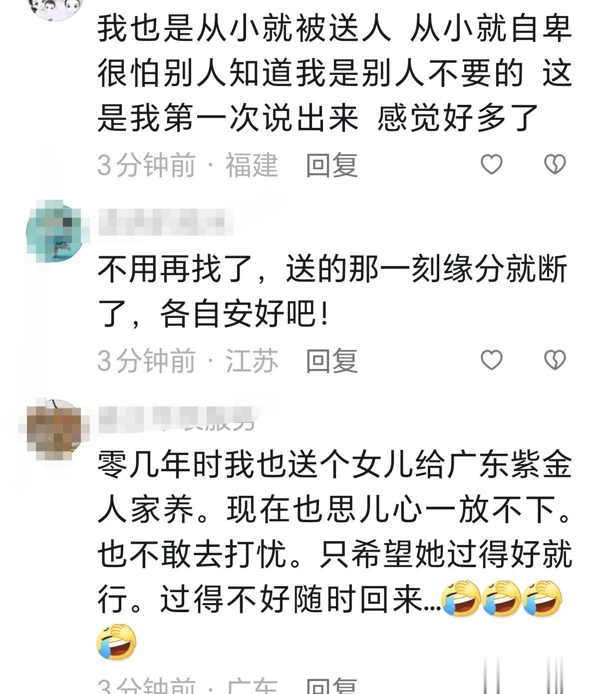 近日河南焦作市,一位父亲因为年轻时候贫困,无力抚养女儿把女儿送人,32年过去了,现在经济条件好了称自己思女心切,希望好心人能够提供线索和他联系。 网友:不用再找了,送的那一刻缘分就断了,各自安好吧! 网友:咋好意思的,当初因为是女孩养不起就送人,现在32年了别人养大了,你要找孩子,打的算盘珠子可真响,想一分钱不花找个人给你养老就直说。 网友:饥荒年代说养不起送人为孩子好还有可能,女儿32岁那个年代不至于养不起吧!