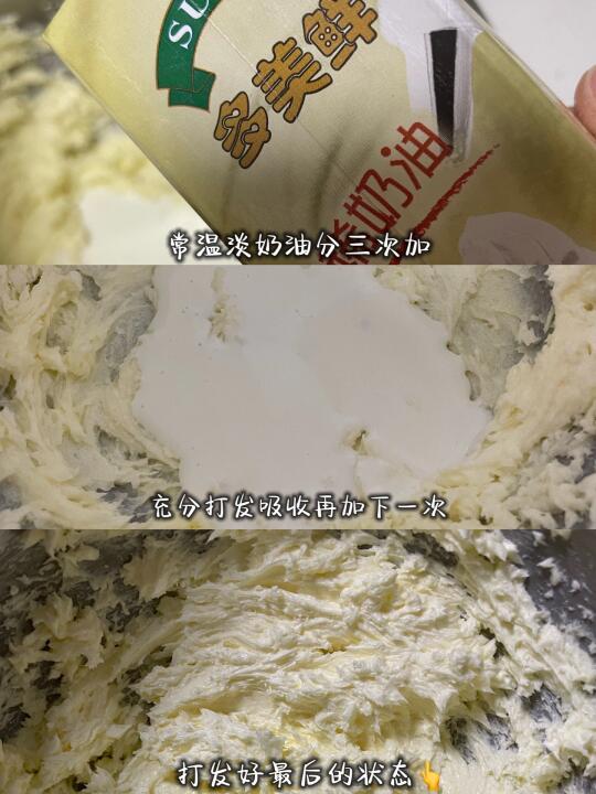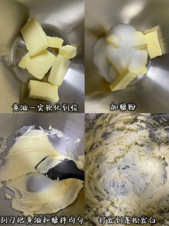 1⃣️软化的无盐黄油加糖粉,先用刮刀拌均匀之后用电动打蛋器搅打发至蓬松发白轻盈