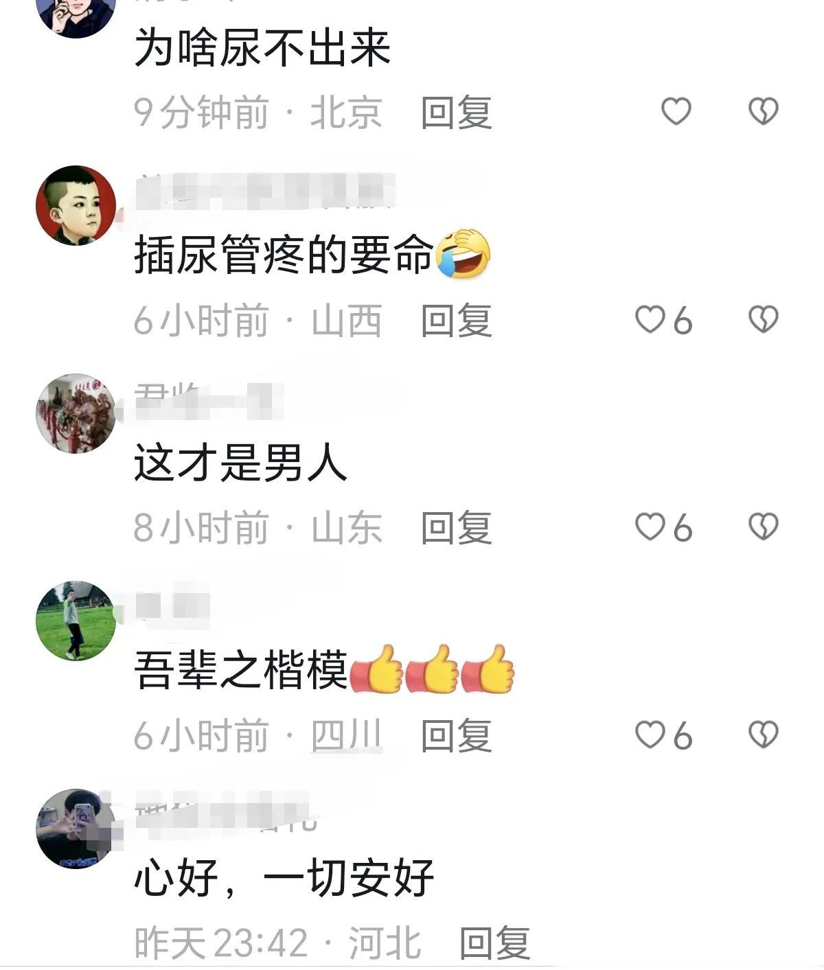 老人生病住院,插导尿管也排不出尿疼得直叫唤,儿子急的用嘴吹导尿管,想给父亲排尿,儿子心疼坏了急出一身汗,这样的孝顺儿子多少钱也换不来。 网友:我妈在马桶坐5小时拉不出来,我也是用手给抠出来的。 网友:插尿管疼的要命。 网友:这才是男人。