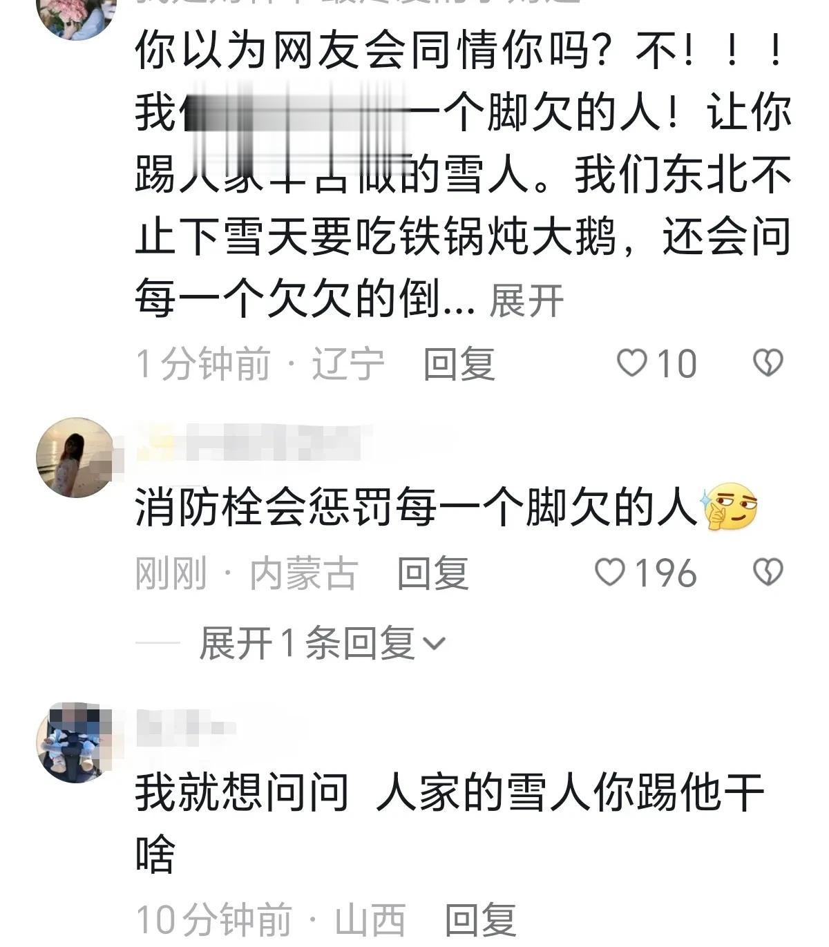 近日,一山东男子,在路边看到一个雪人,一脚踢过去,没想到雪人里面有消防栓,结果把脚趾踢断住院了,唉😔都多大个人了,还这么淘气破坏雪人。 辽宁网友:你以为网友会同情你吗?不!!!我们会嘲笑每一个脚欠的人!让你踢人家辛苦做的雪人。 内蒙古网友:消防栓会惩罚每一个脚欠的人。 山西网友:我就想问问人家的雪人你踢他干啥?