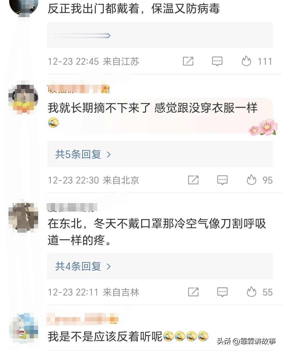 #钟南山不主张长期佩戴口罩# 钟南山认为长期戴口罩,会使自身免疫系统削弱抵御疾病的能力。“除了大的流行病出现,和人群聚集的地方以外,不主张长期佩戴口罩。” 网友:反正出门都戴着,保温又防病毒。 网友:不戴口罩就像没穿衣服一样。 网友:在东北,冬天不戴口罩那冷空气就像刀割呼吸道一样的疼。