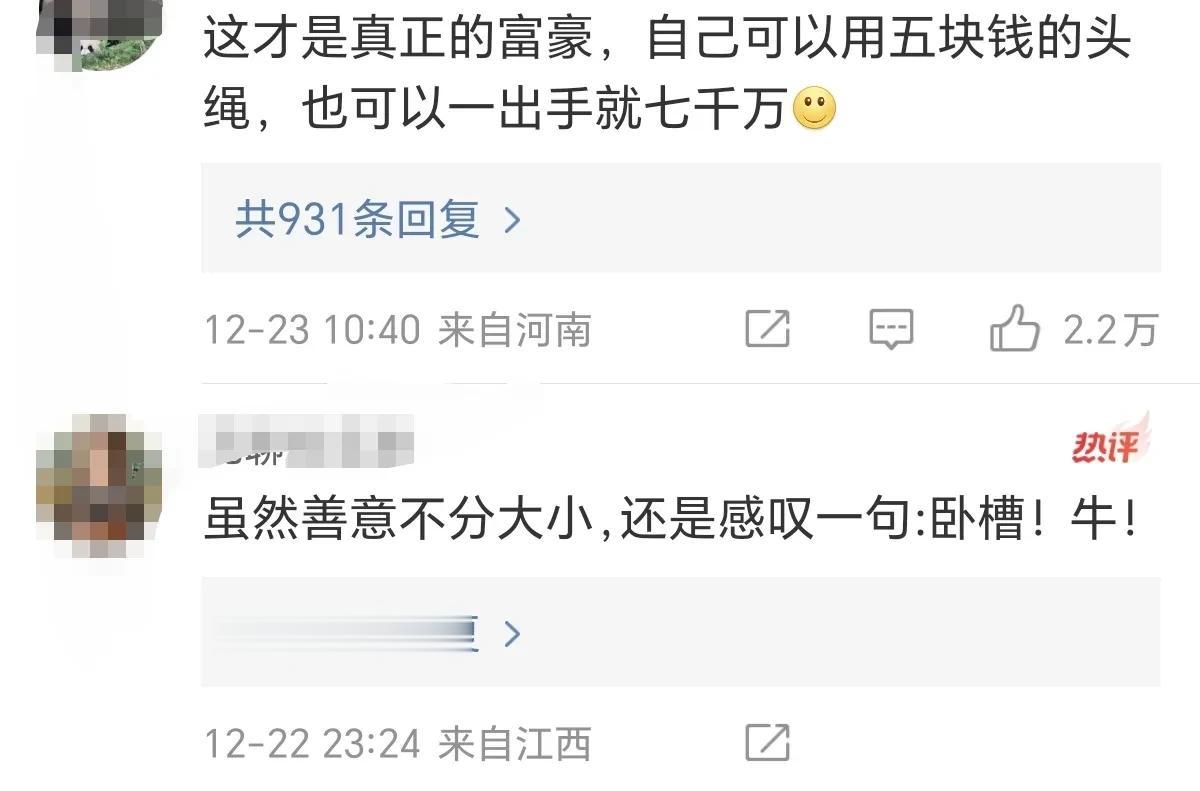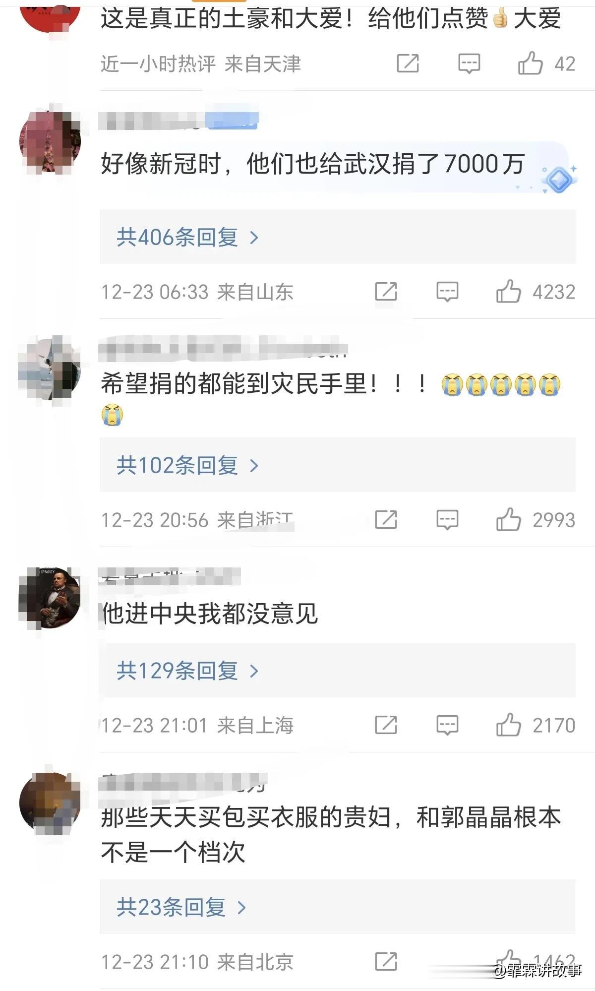 #郭晶晶霍启刚# 郭晶晶霍启刚夫妇为甘肃灾区捐款7000万!被广大网友称赞,地震无情人有情大爱无疆。 网友:好像新冠时,他们也给武汉捐了7000万。 网友:他进中央我都没意见。 网友:我记得那些有钱贵妇还瞧不起郭晶晶,拍照片都排挤郭晶晶,看看大灾大难面前,还得人家霍启刚郭晶晶夫妇,那些贵妇和郭晶晶就不是一个档次的,郭晶晶这一辈子用不着用奢华的外衣名贵珠宝修饰,本身就是一本可以一读再读的书,精神内核强大。 网友:这是真正的富豪,用5元的头绳,一出手就是7000万。