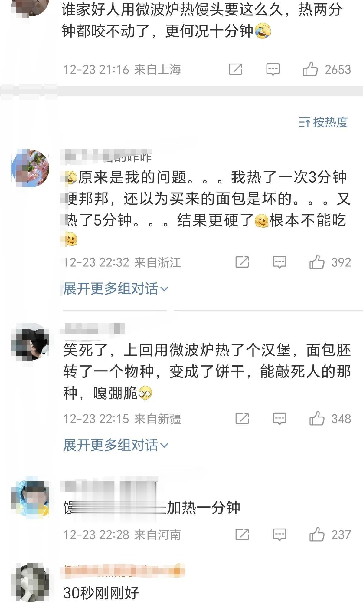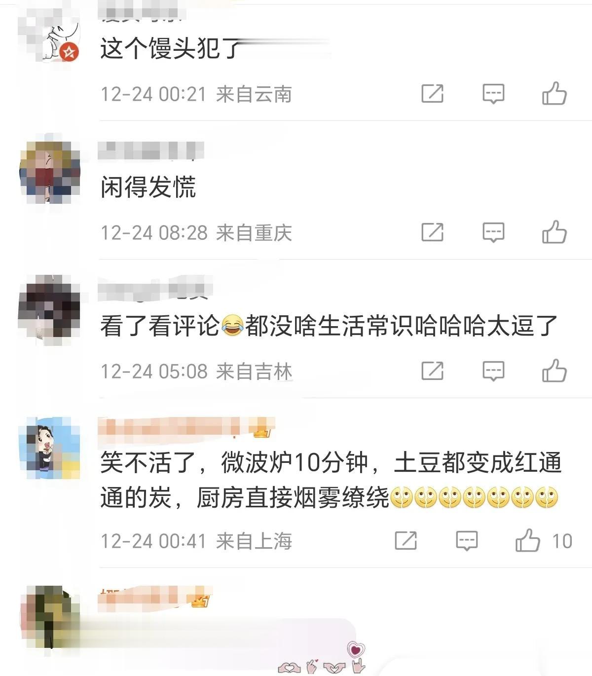 #微波炉# 一网民晒出馒头不停冒烟放毒气,用水泡很久仍然烟雾缭绕,原来是他的不当操作,把馒头放进微波炉里烤了10分钟,导致馒头不停放毒气,他还称这也太丢脸了,这是什么现象?用水泡还在冒烟?熔点太高了么?快点停下来啊!现在小区都知道我吃夜宵搞糊了,不会有人报警吧! 网友:馒头淋水加盖,微波炉热1分钟就好了。 网友:原来是我的问题,我热一次面包3分钟杠杠硬,我以为面包坏了,又热5分钟,结果更硬了,根本吃不了。 网友:这个馒头犯了天条了么? 网友:看了评论区发现大家都没有啥生活常识,哈哈哈太逗了。