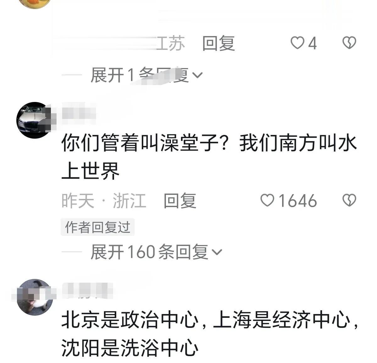 东北网友晒出在沈阳澡堂子,洗完澡玩耍的欢乐画面,怪不得东北人喜欢泡澡堂子呢! 江苏网友:我的天啊!这竟然是澡堂子? 浙江网友:你们管这叫澡堂子?我们南方叫水上世界。 上海网友:北京是政治中心,上海是经济中心,沈阳是洗浴中心。