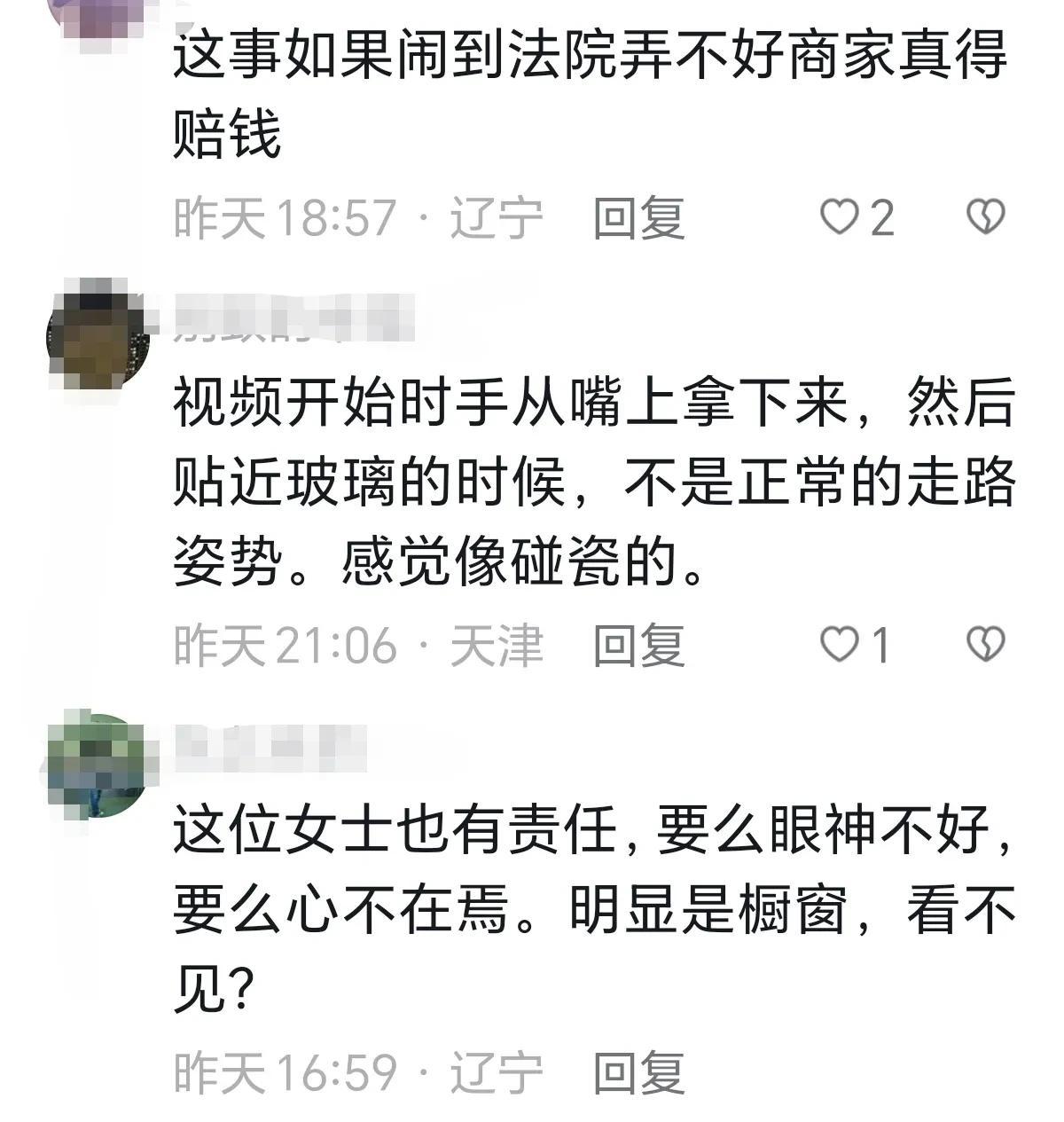 近日浙江,一女子走进一家店铺,结果撞到透明玻璃上,女子撞掉两颗门牙,因此找了商家要求商家赔钱,理由是透明玻璃未贴任何防撞标识。 老板娘:幸亏玻璃没坏,不然你得赔钱,你爱上哪儿告上哪儿告去。 网友:你别说如果走法律程序,没准老板真的需要赔钱。 网友:碰瓷的吧!明显是橱窗,自己眼神不好,还怪别人。