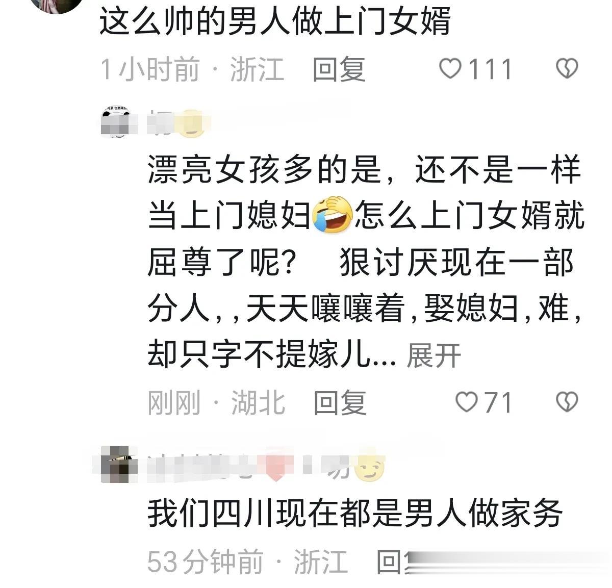近日浙江,新郎进新娘家门拜堂,新娘给新郎开车门,岳父亲自抱新郎下车,开始在想是不是新郎腿受伤了,后面有人说应该是上门女婿,新娘家早早准备好迎接新郎。 网友:这么帅的男人做上么女婿。 网友:我们四川现在都是男人在做家务。 网友:做上门女婿也没啥不好的,老婆漂亮彩礼也省了,吃喝老丈人的,省了多少钱啊!有啥委屈不好的。