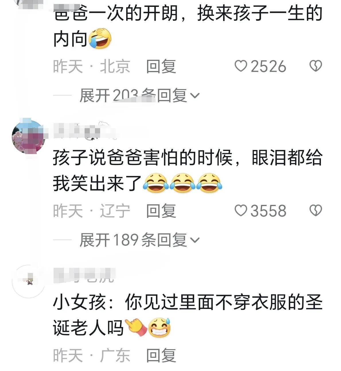 天知道有个东北爸爸,你的童年能有多哭笑不得。 一位辽宁爸爸,在圣诞节为了给女儿惊喜,把自己打扮成了圣诞老人,并准备了礼物,本想哄女儿开心,结果给自己逗的嘎嘎乐,却把女儿吓得嗷嗷哭。 女儿:爸爸害怕。 爸爸:哈哈哈哈哈哈 网友:爸爸一次的开朗,换来孩子一生的内向。 网友:在我们东北不能没有活,当爸爸的容易么?哄玩大宝哄小宝。