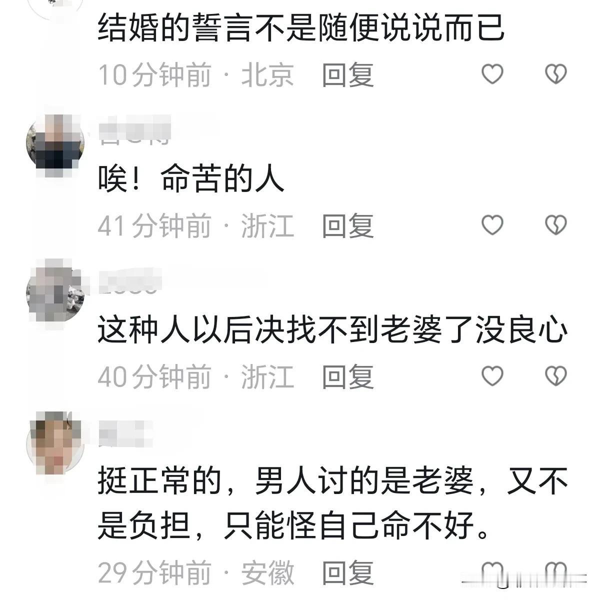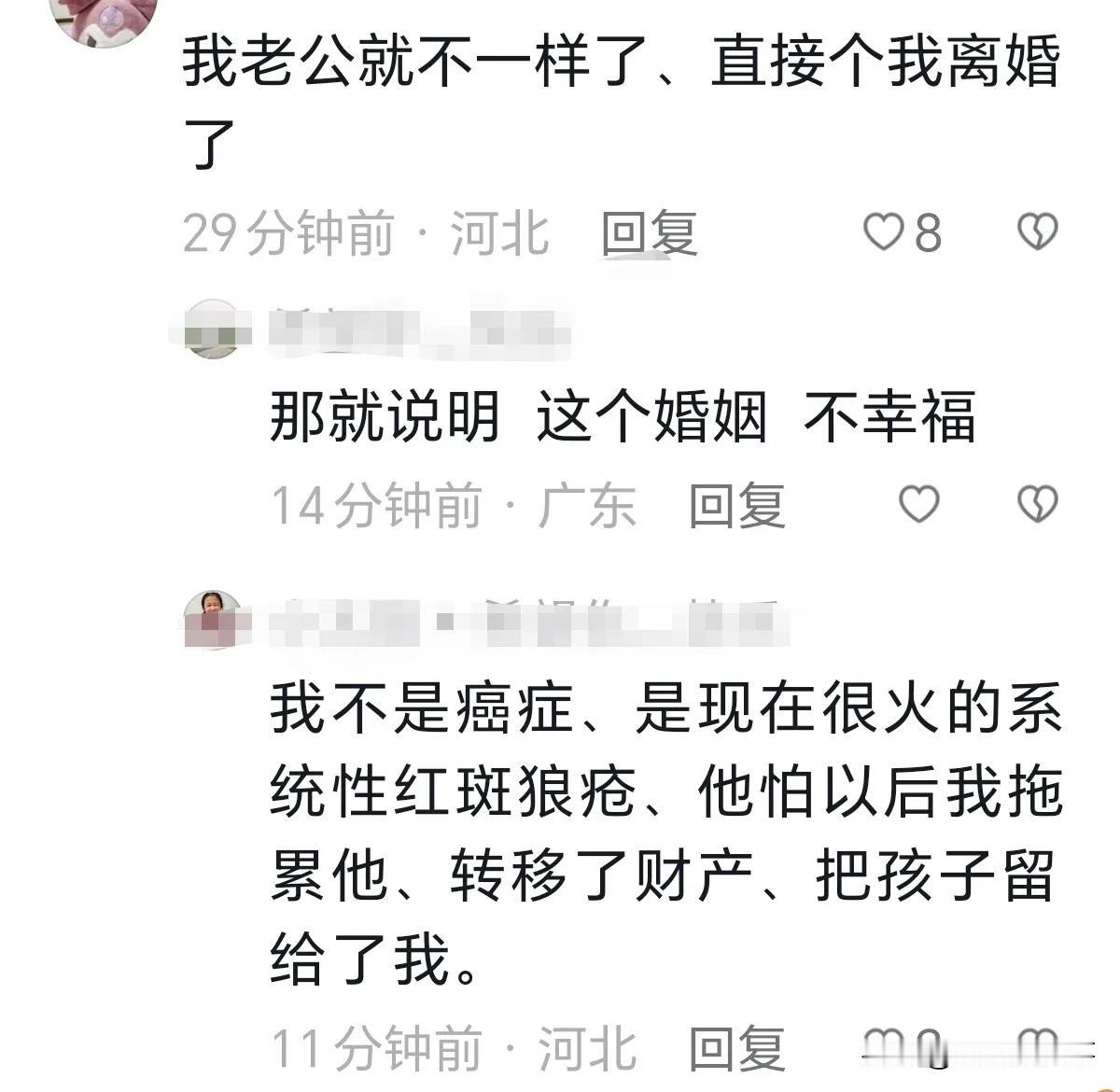 夫妻本是同林鸟,大难临头各自飞。 近日北京一女子因癌症晚期,丈夫将她送回娘家不管不问,两人于2009年登记结婚,2016年女子被诊断为精神疾病,2023年初被诊断出乳腺癌晚期,女子无经收入,她的父母为她欠债治病,实在没有办法将女婿告向法庭。 最后北京房山法院判:男子付2万元医疗费,每月2千抚养费给女子。 网友:我老公就不一样了,直接和我离婚了,转移了财产把孩子留给了我。 网友:挺正常的,男人讨的是老婆,又不是负担,只能怪自己命不好。 网友:看到评论找到不想结婚的理由,因为很多人只想在婚姻中捞好处,却不想在对方生病的时候去照顾对方,不想共患难,那婚姻的意义是什么?