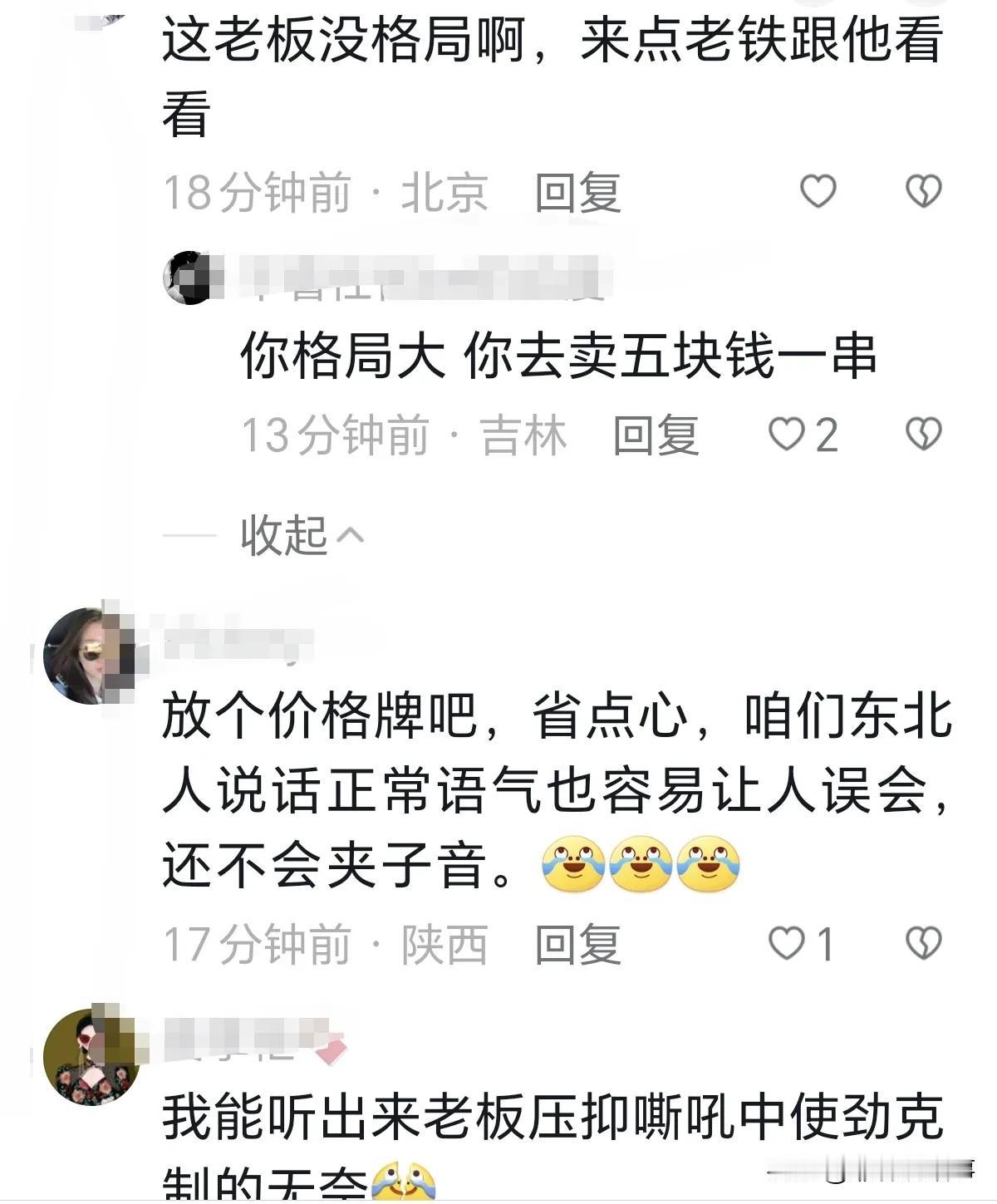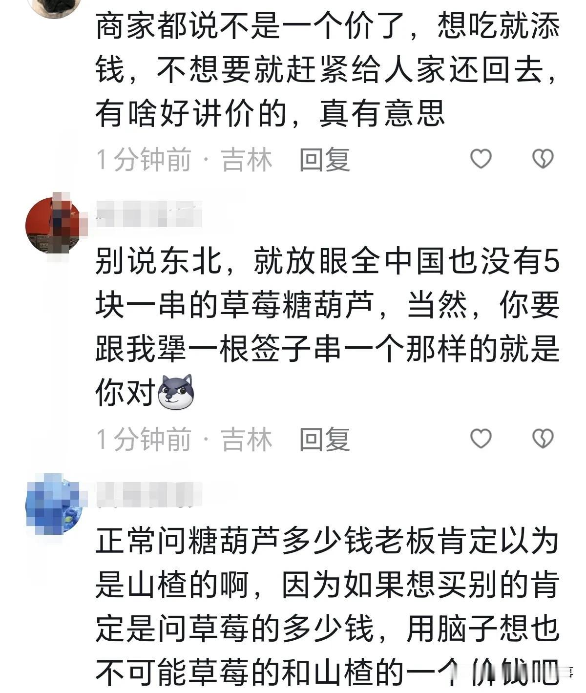 近日黑龙江,山楂糖葫芦五块一根,草莓的15块一根,一位美女游客拿了草莓的糖葫芦,给老板付了五块,大哥说要补10块的差价,草莓的是15元的你玩呢! 美女协商“五块可不可以卖,五元也可以卖的吧”! 大哥说:“没那个价格,要不你就补差价,要不你就放回去,你要是个小孩,我白送你都行,但是没有你这么整的”。 可是美女既不想放回去,也不想付10块钱的差价。 大哥说:“别磨叽了,要不你就放回去,不要破坏市场价格”。