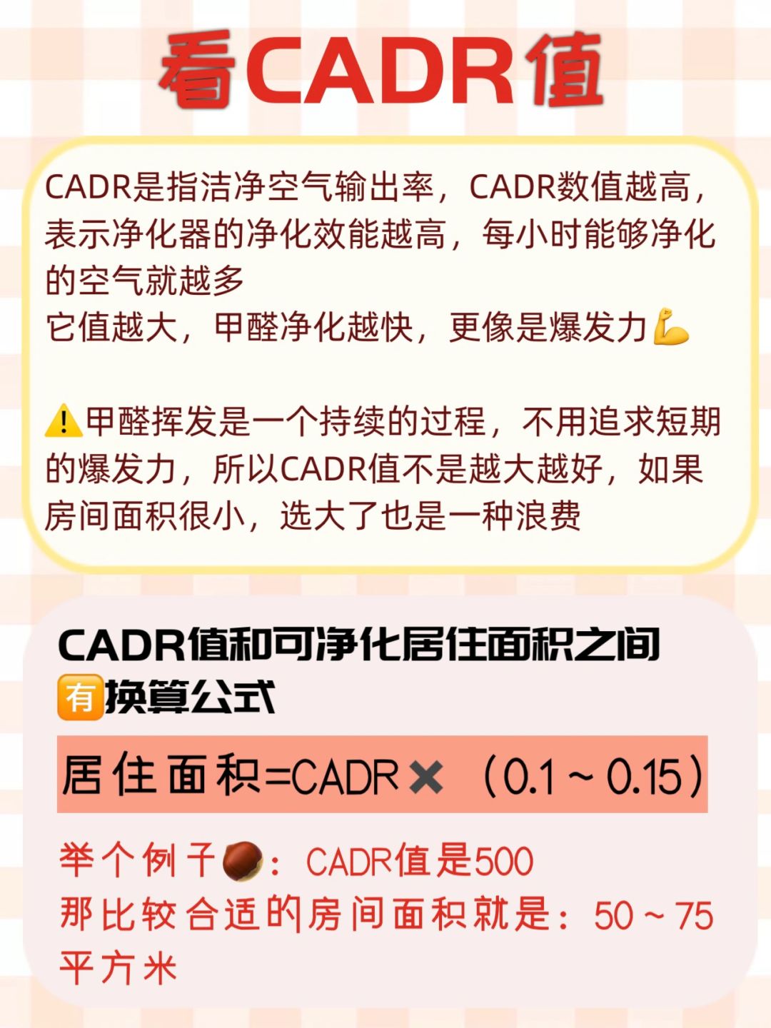 CADR是指洁净空气输出率,CADR数值越高,表示净化器的净化效能越高,每小时能够净化的空气就越多,它值越大,甲醛净化越快,更像是爆发力💪