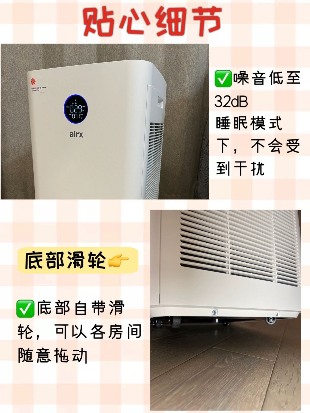 🌈贴心细节:万向轮的设计也方便室内随意拖动,噪音低至32dB,不会影响睡眠💤