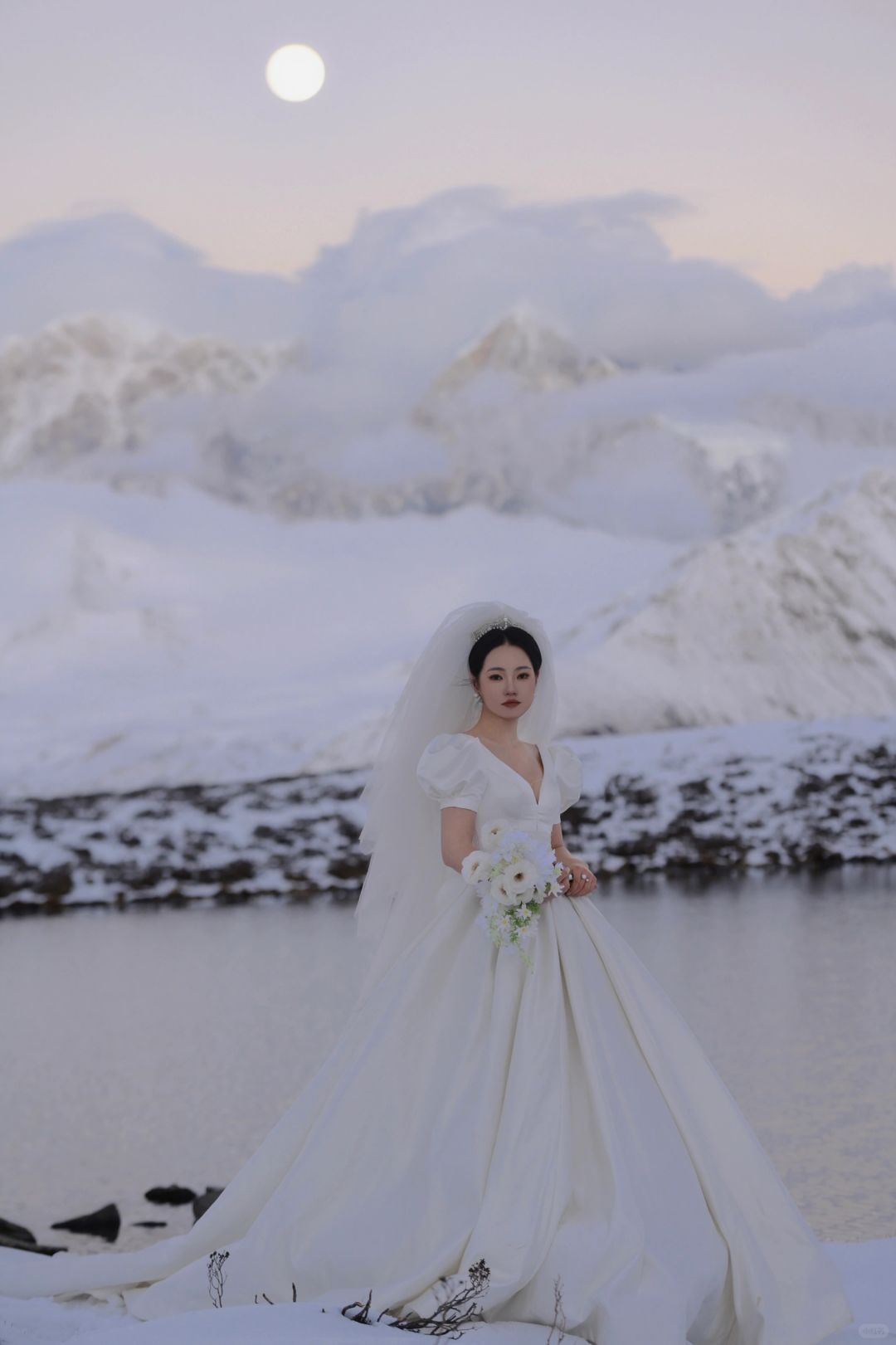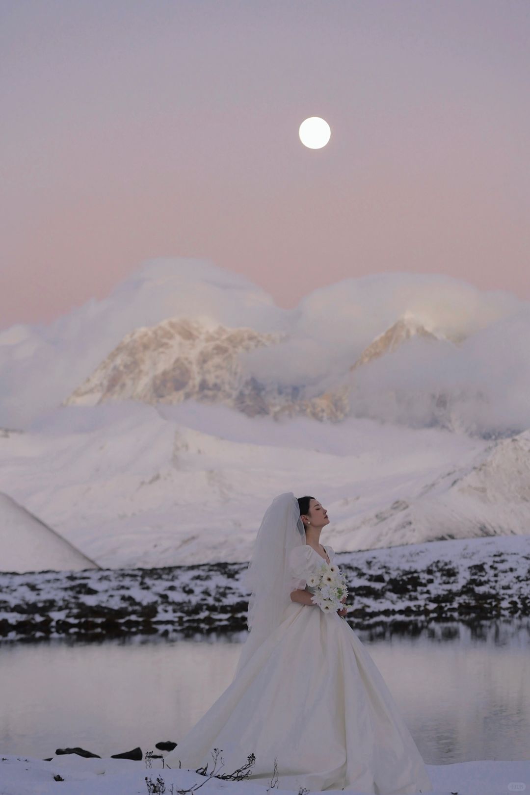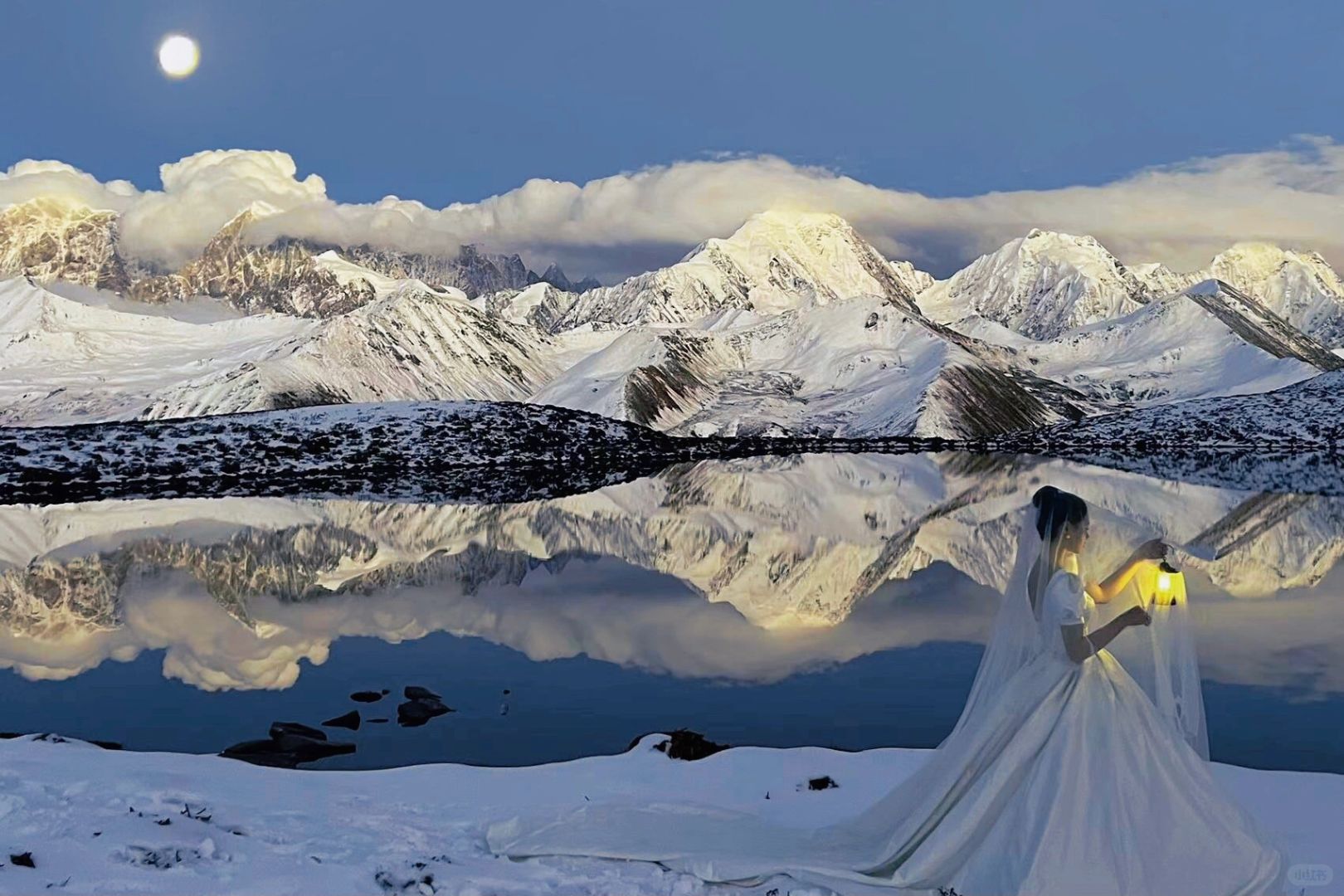 人生照片|日照金山拍了,但更爱贡嘎的月亮。 第一次去川西看贡嘎雪山,就看到了日照金山和日月同辉,感觉也是有些运气在身上的,虽然拍得不是很满意,也算是我的人生照片了。 10月中旬在小红书上看到了很多婚纱旅拍,个人心目中贡噶雪山的取景是天花板了,从动心到决定行程只用了几天,选定了10月27号的拍摄,地点在木雅措(另外两套服装是拍上山前的沿线,也怪没有做什么功课,拍完感觉跟喀纳斯没什么区别有点后悔没有直接只拍雪山,以至于时间只够去木雅措而不够去冷噶措),地形地貌上,二者似乎差不多,好像冷噶措的海子比木雅措要大一些、离雪山更近一些?从新都桥去木雅措比较近,一小时车程开到甲根坝小扎西民宿后换乘当地村民的摩托车上山(约40分钟),由于26号川西普降大雪,上山的羊肠小道异常坎坷艰难,并且直接导致山上温度比以往更低了,拍摄加从垭口徒步到海子边的往返时间一共花了约两小时的时间,期间由于婚纱都是短袖,我的胳膊几乎冻木了,上半身几乎都成了紫红色(;_;),由于云量较多,接近日落时,还看见大片云雾从南侧山坡后向贡嘎雪山几座主峰移动,因此原本在垭口下面海子边的人已经开始往垭口回,可能都以为看不到日照金山了。来都来了,我们也是硬着头皮喘着大气往下徒步,尤其是我的婚纱重达10斤,纯纯的负重前行(-_-),幸运的是当我们花了20分钟走到湖边时,开始出现金山,时间大约是18:30,不到10分钟就消失了,虽然日照金山视线不算特别开阔,云还是有些多,但一轮明月同时出现在了金山旁边,随着日落,风也停了,月亮和成群雪山的倒影就清晰而安静地落在了湖上,真的无法用语言形容出当时的震撼!而且我不知道摄影师怎么回事,居然连一张有月亮倒影的照片都没有拍(-_-),当时时间紧迫顾不上去看成片,事后一看真的挺失望的,那么震撼的景象却完全没有拍出来,一天总费用将近1.6w就拍了个普普通通,唉。这里选了几张选片时个人比较喜欢的照片自己p了一下先发了,p8是先生用手机拍的,p9是化妆师手机拍的,感觉都比摄影师拍的好(-_-),剩下的照片精修出来要三个月以后了。也罢,人生总有遗憾。