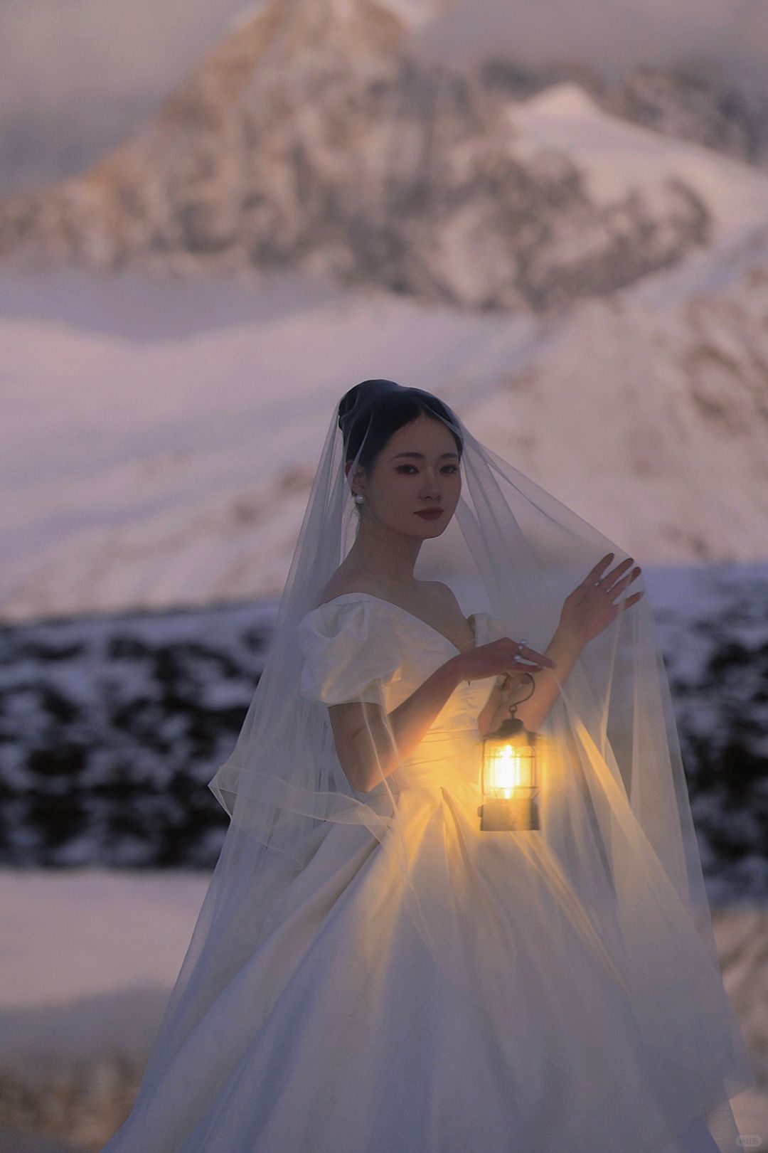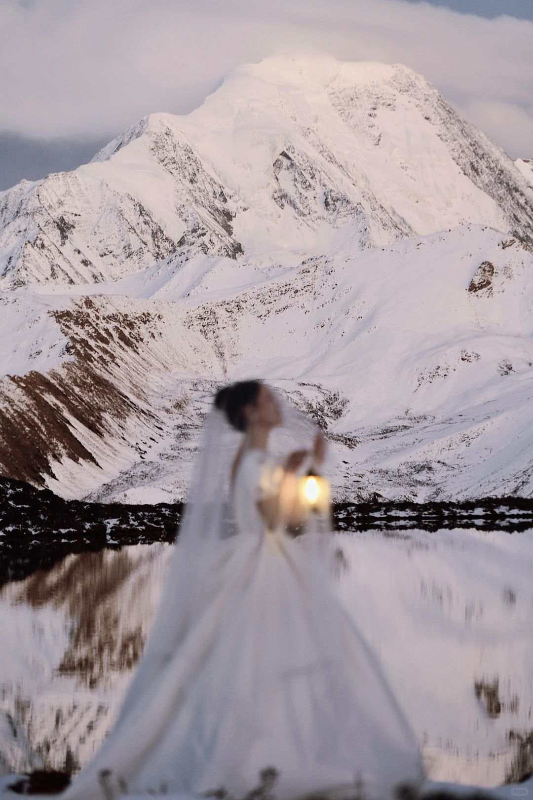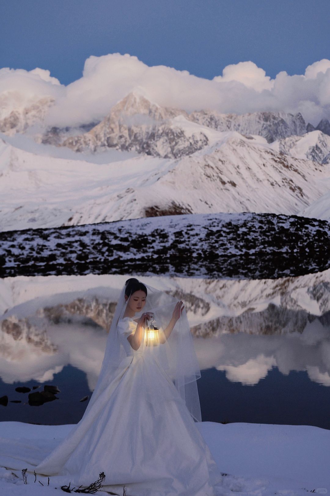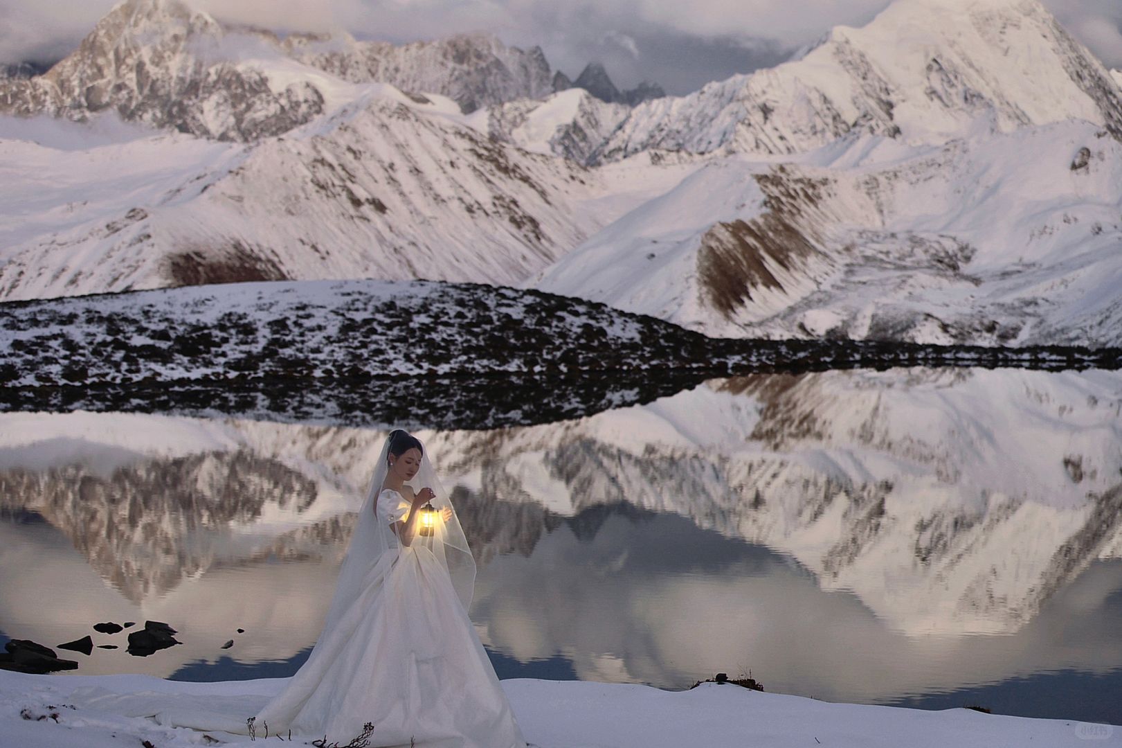 人生照片|日照金山拍了,但更爱贡嘎的月亮。 第一次去川西看贡嘎雪山,就看到了日照金山和日月同辉,感觉也是有些运气在身上的,虽然拍得不是很满意,也算是我的人生照片了。 10月中旬在小红书上看到了很多婚纱旅拍,个人心目中贡噶雪山的取景是天花板了,从动心到决定行程只用了几天,选定了10月27号的拍摄,地点在木雅措(另外两套服装是拍上山前的沿线,也怪没有做什么功课,拍完感觉跟喀纳斯没什么区别有点后悔没有直接只拍雪山,以至于时间只够去木雅措而不够去冷噶措),地形地貌上,二者似乎差不多,好像冷噶措的海子比木雅措要大一些、离雪山更近一些?从新都桥去木雅措比较近,一小时车程开到甲根坝小扎西民宿后换乘当地村民的摩托车上山(约40分钟),由于26号川西普降大雪,上山的羊肠小道异常坎坷艰难,并且直接导致山上温度比以往更低了,拍摄加从垭口徒步到海子边的往返时间一共花了约两小时的时间,期间由于婚纱都是短袖,我的胳膊几乎冻木了,上半身几乎都成了紫红色(;_;),由于云量较多,接近日落时,还看见大片云雾从南侧山坡后向贡嘎雪山几座主峰移动,因此原本在垭口下面海子边的人已经开始往垭口回,可能都以为看不到日照金山了。来都来了,我们也是硬着头皮喘着大气往下徒步,尤其是我的婚纱重达10斤,纯纯的负重前行(-_-),幸运的是当我们花了20分钟走到湖边时,开始出现金山,时间大约是18:30,不到10分钟就消失了,虽然日照金山视线不算特别开阔,云还是有些多,但一轮明月同时出现在了金山旁边,随着日落,风也停了,月亮和成群雪山的倒影就清晰而安静地落在了湖上,真的无法用语言形容出当时的震撼!而且我不知道摄影师怎么回事,居然连一张有月亮倒影的照片都没有拍(-_-),当时时间紧迫顾不上去看成片,事后一看真的挺失望的,那么震撼的景象却完全没有拍出来,一天总费用将近1.6w就拍了个普普通通,唉。这里选了几张选片时个人比较喜欢的照片自己p了一下先发了,p8是先生用手机拍的,p9是化妆师手机拍的,感觉都比摄影师拍的好(-_-),剩下的照片精修出来要三个月以后了。也罢,人生总有遗憾。